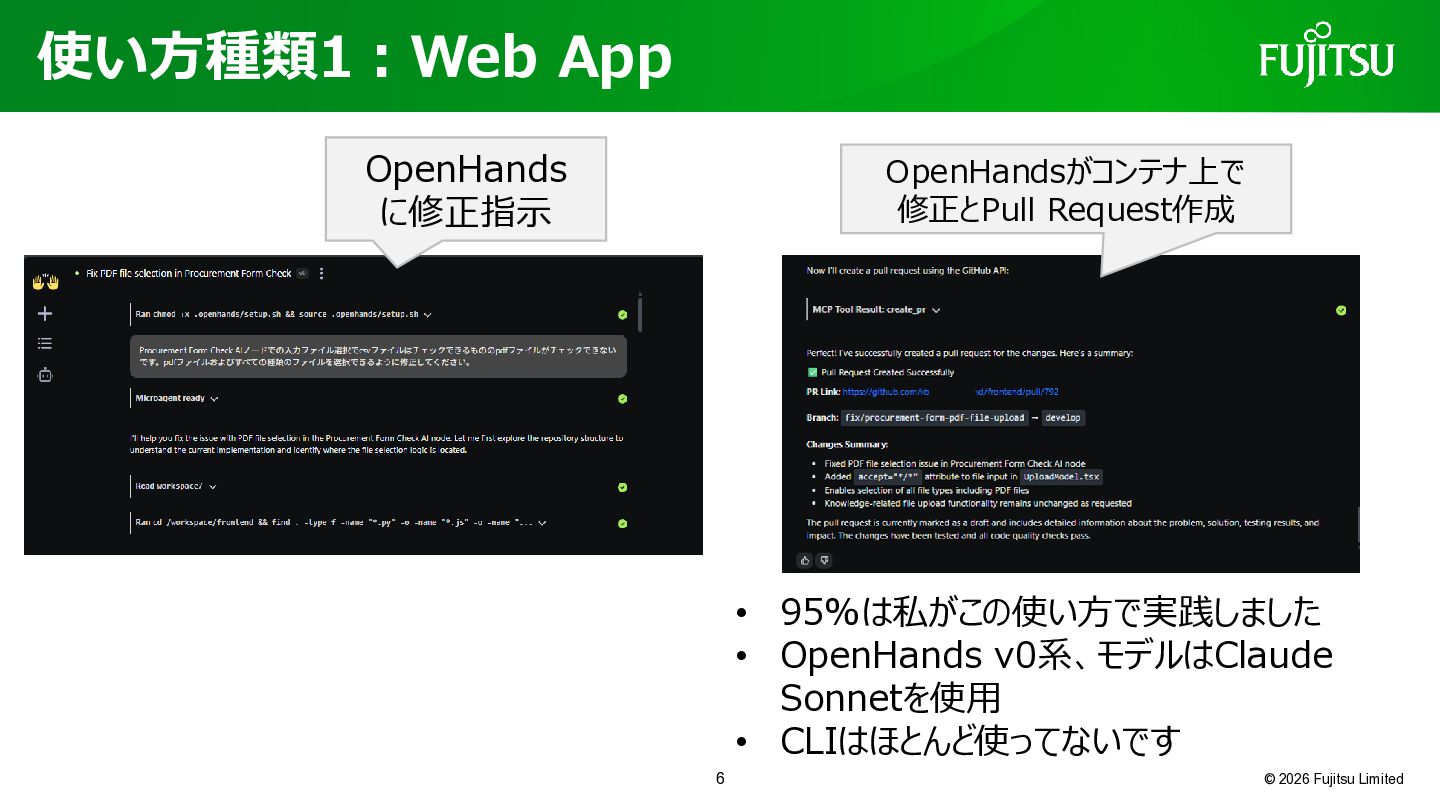使い方種類1:Web App © 2026 Fujitsu Limited OpenHands に修正指示 OpenHandsがコンテナ上で 修正とPull
