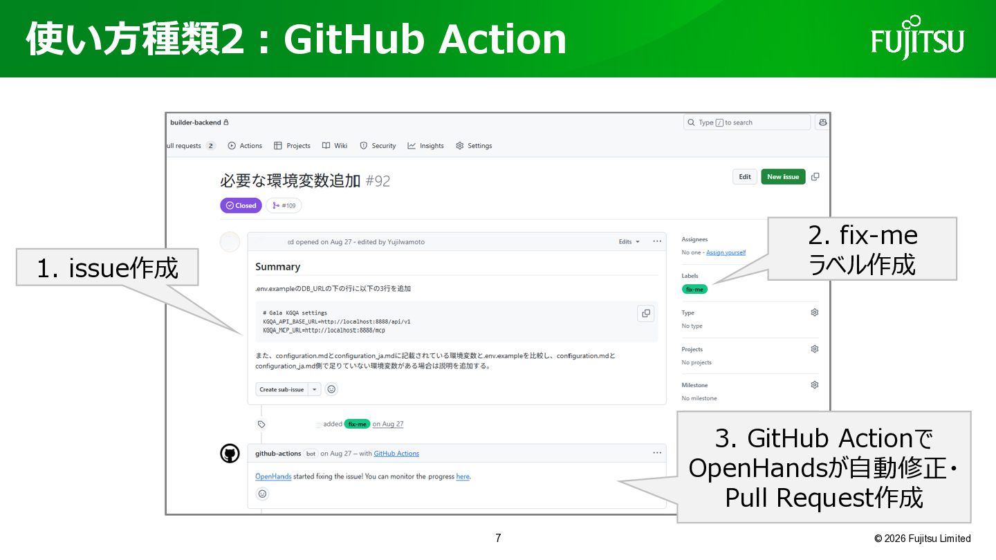 使い方種類2:GitHub Action © 2026 Fujitsu Limited 1. issue作成 2. fix-me