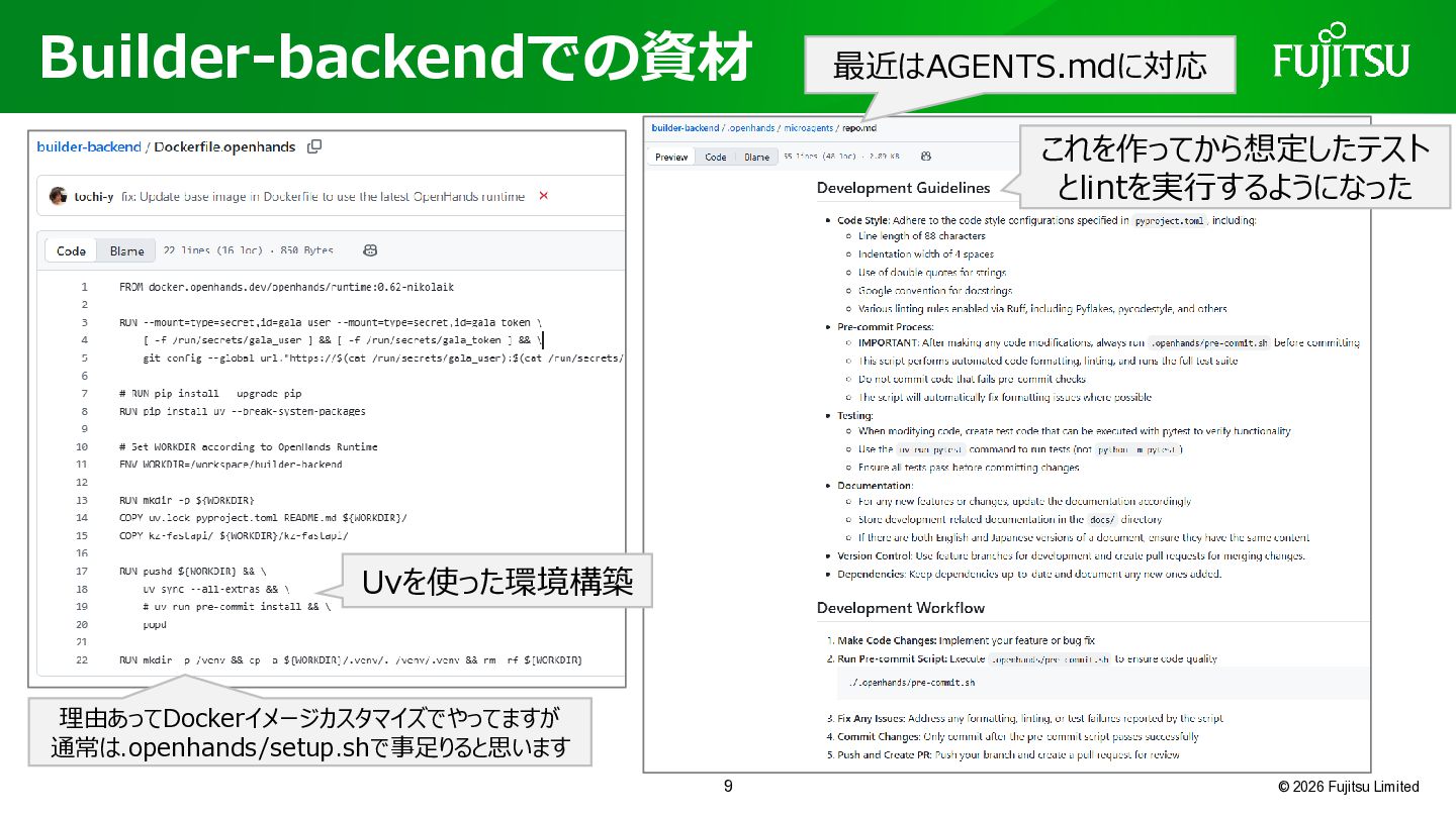 Builder-backendでの資材 © 2026 Fujitsu Limited 理由あってDockerイメージカスタマイズでやってますが 通常は.openhands/setup.shで事足りると思います これを作ってから想定したテスト とlintを実行するようになった Uvを使った環境構築