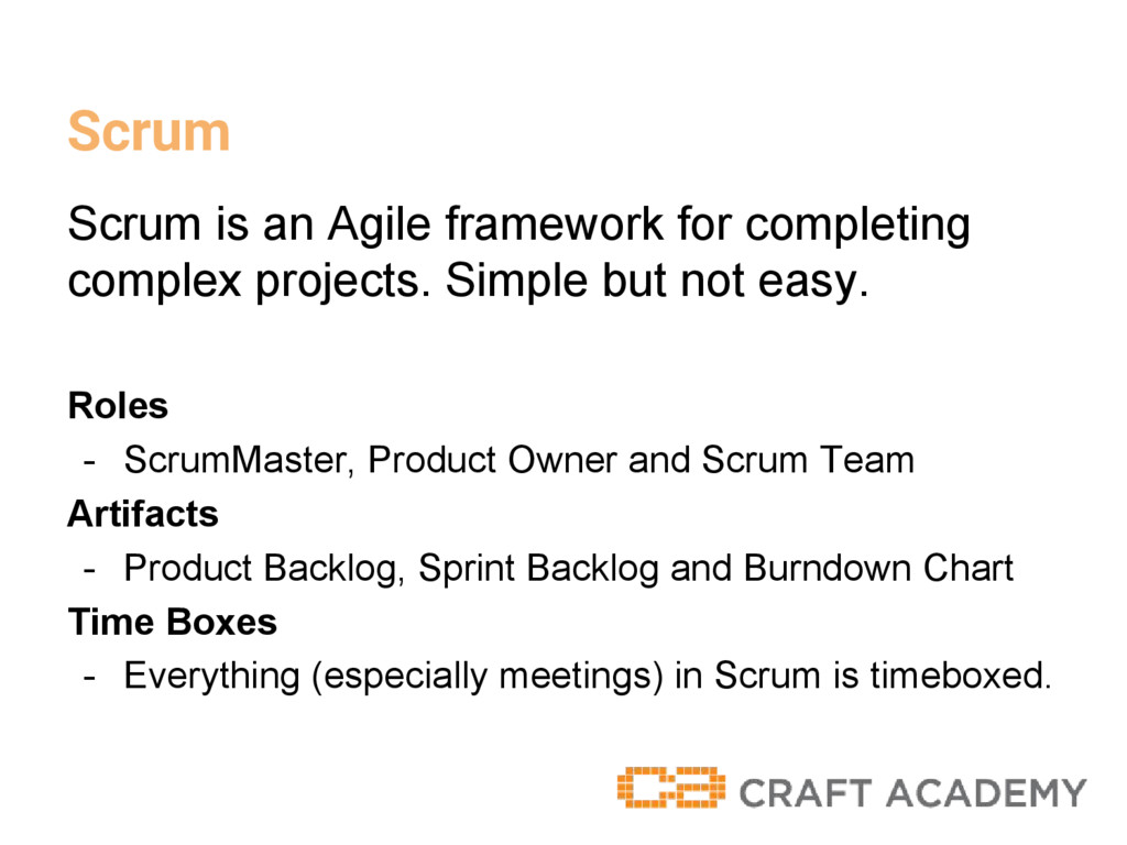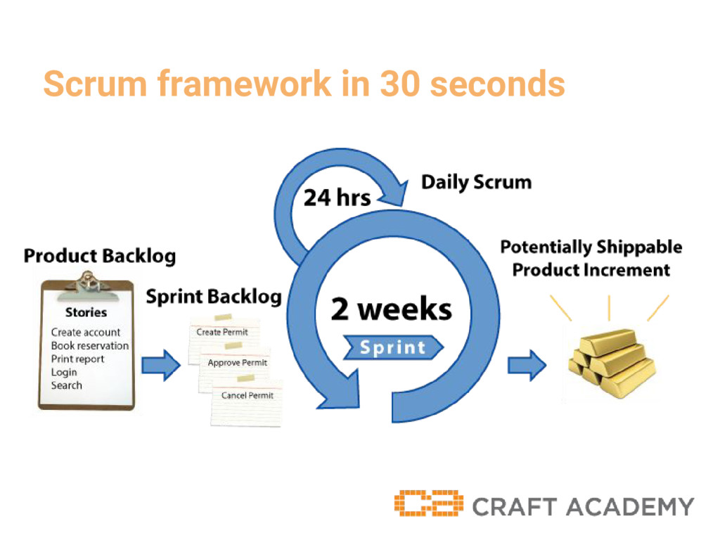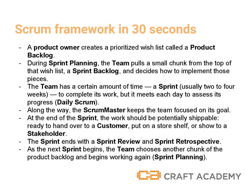 a prioritized wish list called a Product Backlog. - During Sprint Planning, the Team pulls a small chunk from the top of that wish list, a Sprint Backlog, and decides how to implement those pieces. - The Team has a certain amount of time — a Sprint (usually two to four weeks) — to complete its work, but it meets each day to assess its progress (Daily Scrum). - Along the way, the ScrumMaster keeps the team focused on its goal. - At the end of the Sprint, the work should be potentially shippable: ready to hand over to a Customer, put on a store shelf, or show to a Stakeholder. - The Sprint ends with a Sprint Review and Sprint Retrospective. - As the next Sprint begins, the Team chooses another chunk of the product backlog and begins working again (Sprint Planning).