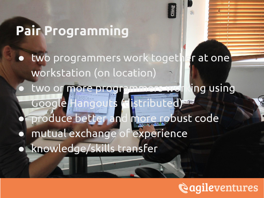 (on location) • two or more programmers working using Google Hangouts (distributed) • produce better and more robust code • mutual exchange of experience • knowledge/skills transfer