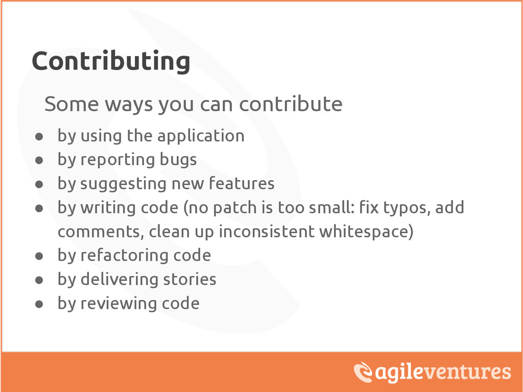 application • by reporting bugs • by suggesting new features • by writing code (no patch is too small: fix typos, add comments, clean up inconsistent whitespace) • by refactoring code • by delivering stories • by reviewing code
