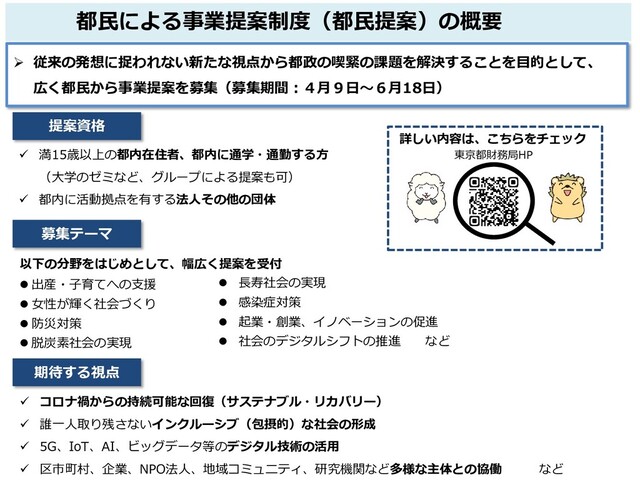 東京都は、従来の発想に捉われない新たな視点から都政の喫緊の課題を解決することを目的として、都民による事業提案制度を実施いたします。 令和3年4月9日から同年6月18日まで提案の募集を受け付けています。皆様からいただいたご提案を、令和4年度の施策に反映させてまいりますので、多数のご応募をお待ちしております。