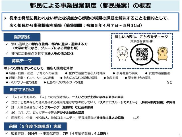 都内に活動拠点を有する法人その他の団体 募集テーマ 以下の分野をはじめとして、幅広く提案を受付 • 結婚・妊娠・出産・子育てへの支援 • 世界で活躍できる人材育成 • 長寿社会の実現 • 女性の活躍推進 • 起業・創業・イノベーションの創出 • 魅力にあふれた都市の実現 • 防災対策 • 脱炭素社会の実現 • バリアフリー化の推進 • 社会のデジタルシフトの推進 など 「人」の力を高め、「人」の力を引き出し、一人ひとりが主役になれる東京の実現 コロナとも共存した活気あふれる東京を確かなものにしていく「サステナブル・リカバリー」(持続可能な回復)の実現 誰一人取り残さないインクルーシブ(包摂的)な社会の形成 5G、IoT、AI、ビッグデータ等のデジタル技術の活用 区市町村、企業、NPO法人、地域コミュニティ、研究機関など多様な主体との協働 など 詳しい内容は、こちらをチェック 東京都財務局HP 1 前回(5年度予算編成)実績 応募件数:684件 ⇒ 事業化件数:7件(4年度予算額:4.1億円)