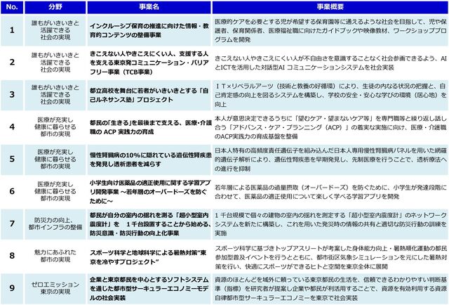 医療的ケアを必要とする児が希望する保育園等に通えるような社会を目指して、児や保 護者、保育関係者、医療福祉職に向けたガイドブックや映像教材、ワークショッププロ グラムを開発 2 誰もがいきいきと 活躍できる 社会の実現 きこえない人やきこえにくい人、支援する人 を支える東京発コミュニケーション・バリア フリー事業(TCB事業) きこえない人やきこえにくい人が不自由さを意識することなく社会参画できるよう、AI とICTを活用した対話型AI コミュニケーションシステムを社会実装 3 誰もがいきいきと 活躍できる 社会の実現 都立高校を舞台に若者がいきいきとする「自 己ルネサンス塾」プロジェクト IT×リベラルアーツ(技術と教養の好循環)により、生徒の内なる状況の把握と、自 己肯定感の向上を図るシステムを構築し、学校の安全・安心な学びの環境(居心地)を 向上 4 医療が充実し 健康に暮らせる 都市の実現 都民の「生きる」を最後まで支える、医療・介護 職の ACP 実践力の育成 本人が意思決定できるうちに「望むケア・望まないケア等」を専門職等と繰り返し話し 合う「アドバンス・ケア・プランニング(ACP)」の着実な実施に向け、医療・介護職 のACP実践力の育成基盤を整備 5 医療が充実し 健康に暮らせる 都市の実現 慢性腎臓病の10%に隠れている遺伝性腎疾患 を発見し透析患者を減らす 日本人特有の高頻度責任遺伝子を組み込んだ日本人専用慢性腎臓病パネルを用いた網羅 的遺伝子解析により、遺伝性腎疾患を早期発見し、先制医療を行うことで、透析療法へ の進行を抑制 6 医療が充実し 健康に暮らせる 都市の実現 小学生向け医薬品の適正使用に関する学習アプ リ開発事業 ~若年層のオーバードーズを防ぐ ために~ 若年層による医薬品の過量摂取(オーバードーズ)を防ぐために、小学生が発達段階に 合わせて、医薬品の適正使用について楽しく学べる学習アプリを開発 7 防災力の向上、 都市インフラの整備 都民が自分の室内の揺れを測る「超小型室内 震度計」を 1千台設置することから始める、 防災意識・防災行動の向上化事業 1 千台規模で個々の建物の室内の揺れを測定する「超小型室内震度計」のネットワーク システムを新たに構築し、これを用いた発災時の情報の共有と適切な防災行動の訓練を 実施 8 魅力にあふれた 都市の実現 スポーツ科学と地球科学による暑熱対策“東 京を冷やすプロジェクト” スポーツ科学に基づきトップアスリートが考案した身体能力向上・暑熱順化運動の都民 参加型普及イベントを行うとともに、都市街区気象シミュレーションを元にした暑熱対 策を行い、快適にスポーツができるヒトと空間を東京全体に展開 9 ゼロエミッション 東京の実現 企業と東京都民を中心とするソフトシステム を通じた都市型サーキュラーエコノミーモデ ルの社会実装 資源のほとんどを域外に頼っている東京都民の生活を、信頼できるわかりやすい判断基 準(指標)を研究者が提案し企業や都民が利活用することで、資源を有効利用する資源 自律都市型サーキュラーエコノミーを東京で社会実装