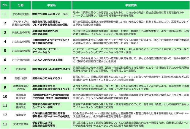 アクティブな 長寿社会の実現 公園を活用した高齢者の フレイル予防と地域交流の促進 都内の公園等に設置された健康遊具の正しい使い方を広く普及・啓発することにより、高齢者のフレイ ル予防や地域交流を促進 3 共生社会の実現 身体障害者補助犬への 理解促進事業 小中学生等の身体障害者補助犬(盲導犬・介助犬・聴導犬)への理解促進を、より一層図るため、広報 活動を展開し、インクルーシブシティ東京の実現を促進 4 共生社会の実現 公共図書館をよりアクセシブルに! 電子書籍等の充実 都立図書館がより多くの都民にとってアクセシブルな場所となるよう、読み上げ機能付きの電子書籍な どの導入を通じ、都立図書館の利用者サービスを一層向上 5 共生社会の実現 こども向けバリアフリー アニメーション バリアフリーについて、こどもが分かりやすく、楽しく学べるよう、こどもに人気なキャラクター等と コラボレーションしたアニメーションを作成・発信 6 共生社会の実現 こころといのちを守る事業 近年、自ら命を絶つ人が増えている深刻な状況を受けて、駅などの身近な施設において、悩みや困りご とに関する相談窓口の案内などを実施 7 防災対策 防災対策で正しい知識をつけよう 災害発生直後からの3日間(救助・救命活動を優先される期間)にとるべき行動を学ぶための防災体験 教室を地域や学校などで開催し、地域防災力を一層強化 8 医療・健康 医療のかかり方を知ろう! 都民に対して、日頃の医療機関とのコミュニケーションの取り方や緊急を要する際の対処方法などの医 療機関へかかる際のポイント等についての周知を実施 9 農林水産業の 活性化 東京産食材を使った 東京の郷土料理を味わうイベント より多くの方々に、東京の「農」や「食」の多彩な魅力を発見していただけるよう、東京産食材を使用 した東京の郷土料理を味わい、体験していただけるイベントを開催 10 住環境の 維持向上 長期修繕を起点とした都内賃貸共同 住宅の修繕・省エネ・防災問題解決 都内の賃貸共同住宅等の所有者に対し、長期修繕計画の作成支援や省エネ等に関するアドバイザー派遣 を通じて、マンションの適切な維持管理等を促進 11 住環境の 維持向上 空き家の再利用に関する ムーブメント事業 空き家の再利用に関する様々な普及・啓発を実施することで、空き家を「資産」として積極的に活用し ていくムーブメントを東京から発信 12 環境保全 化学物質の適正管理に関する 事業者向けデータベースの充実化 SDS(安全データシート)提出等に必要となる情報収集・整理の円滑化に資する事業者向けのデータベー スを充実化させ、化学物質の適正な管理を一層促進 13 交通安全対策 都立学校における 自転車安全啓発事業 特に高校生にとって身近な自転車についての交通安全意識の向上を一層図るため、自転車の交通ルール や事故発生時のシチュエーションなどに関する普及啓発を実施