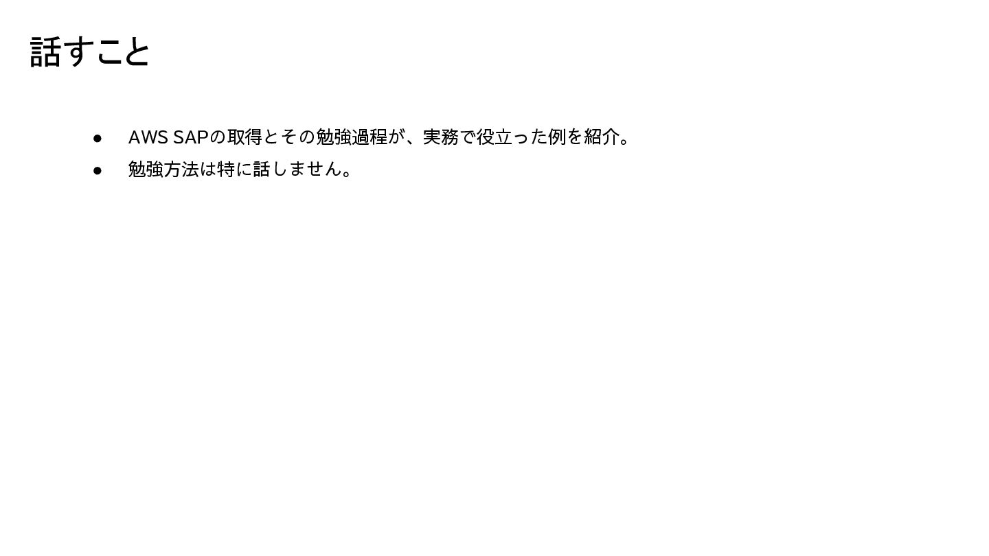話すこと • AWS SAPの取得とその勉強過程が、実務で役立った例を紹介。 • 勉強方法は特に話しません。