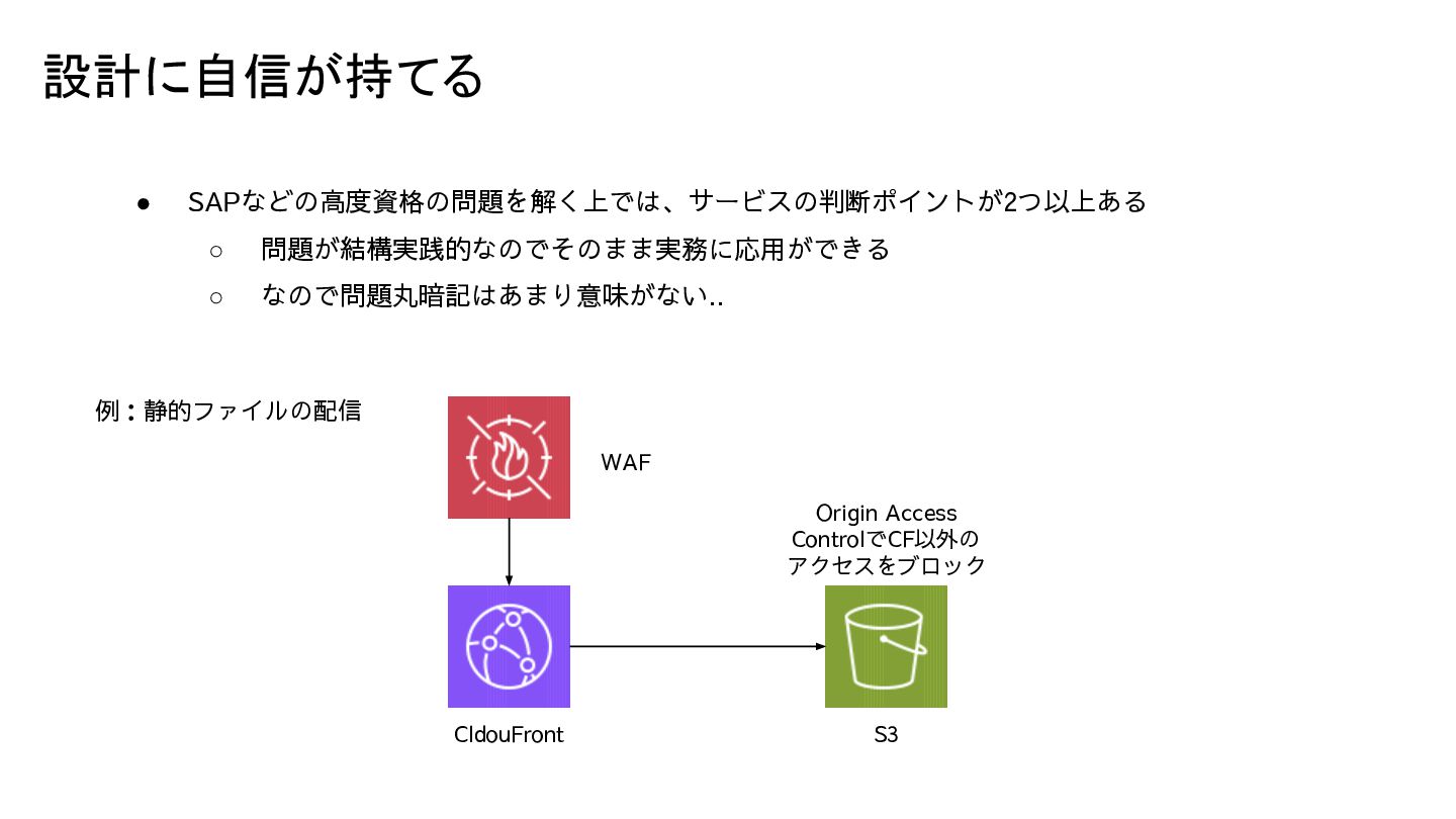 設計に自信が持てる • SAPなどの高度資格の問題を解く上では、サービスの判断ポイントが2つ以上ある ◦ 問題が結構実践的なのでそのまま実務に応用ができる ◦ なので問題丸暗記はあまり意味がない.. 例:静的ファイルの配信 WAF CldouFront