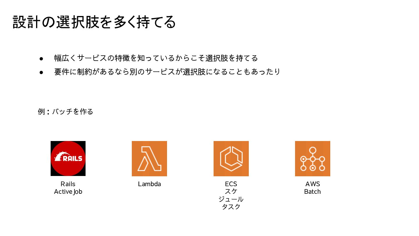 • 幅広くサービスの特徴を知っているからこそ選択肢を持てる • 要件に制約があるなら別のサービスが選択肢になることもあったり 設計の選択肢を多く持てる 例:バッチを作る Rails ActiveJob Lambda ECS