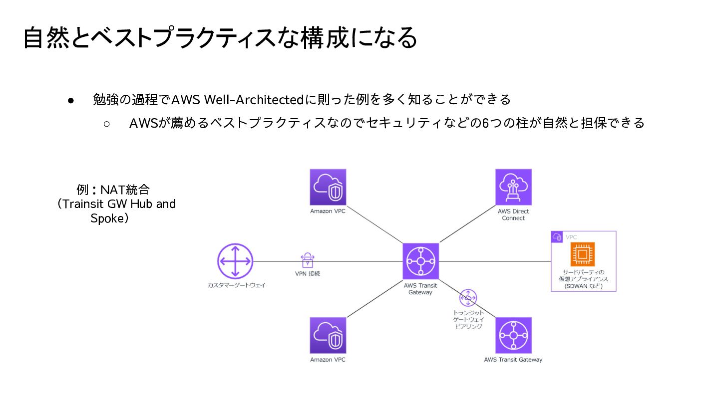 自然とベストプラクティスな構成になる • 勉強の過程でAWS Well-Architectedに則った例を多く知ることができる ◦ AWSが薦めるベストプラクティスなのでセキュリティなどの6つの柱が自然と担保できる 例:NAT統合 (Trainsit GW Hub