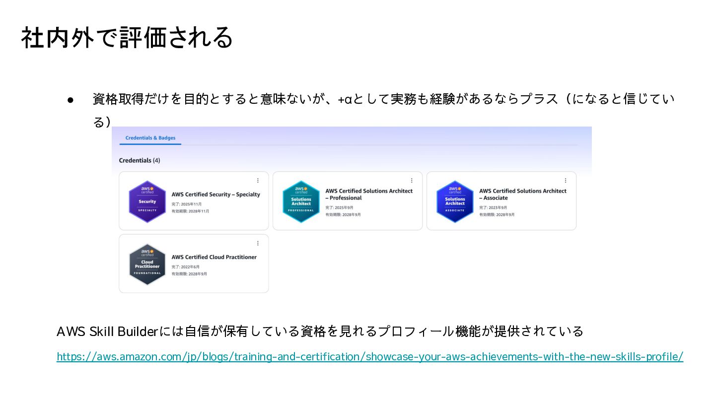 社内外で評価される • 資格取得だけを目的とすると意味ないが、+αとして実務も経験があるならプラス(になると信じてい る) https://aws.amazon.com/jp/blogs/training-and-certification/showcase-your-aws-achievements-with-the-new-skills-profile/ AWS Skill Builderには自信が保有している資格を見れるプロフィール機能が提供されている