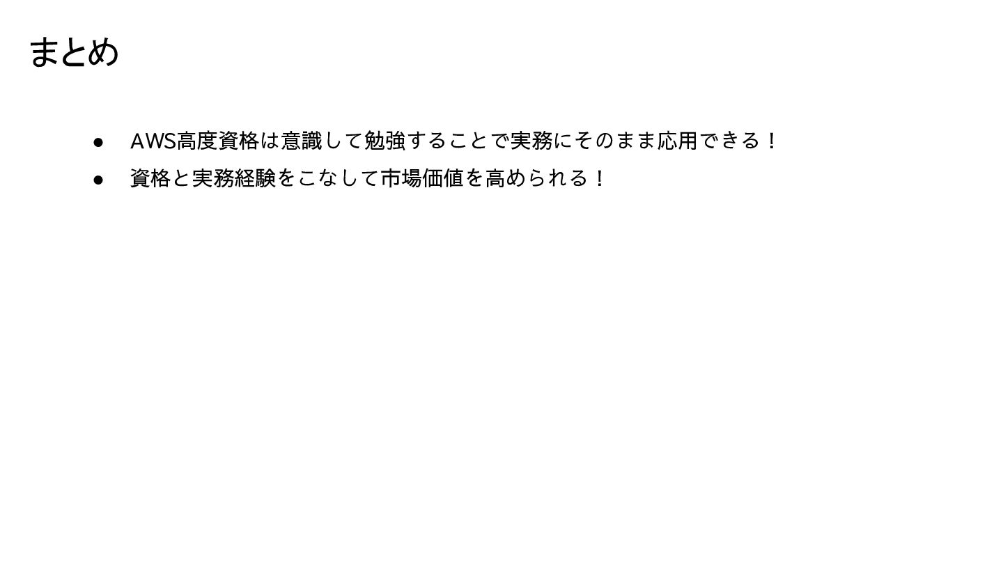まとめ • AWS高度資格は意識して勉強することで実務にそのまま応用できる! • 資格と実務経験をこなして市場価値を高められる!