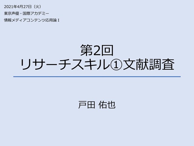 学校名:東京声優・国際アカデミー 学科名:国際コミュニケーション学科 科目名:情報メディアコンテンツ応用論Ⅰ 日程:2021年4月27日(火) タイトル:第2回 意思決定のための情報収集 講師:戸田佑也