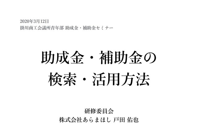 掛川商工会議所青年部の研修セミナー向けに作成した「助成金・補助金検索・活用方法」に関する資料です。