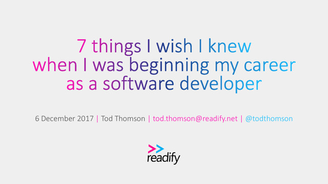 own career 02 Everything you learned at university is wrong (clickbait) 04 The super-power that is "plain text" 07 Don't program for yourself, program for the next person (or 3am you) 05 Never forget the Prime Directive… How to win at interviews 03 Learn you some JavaScript (and Functional Programming) for great good! 06