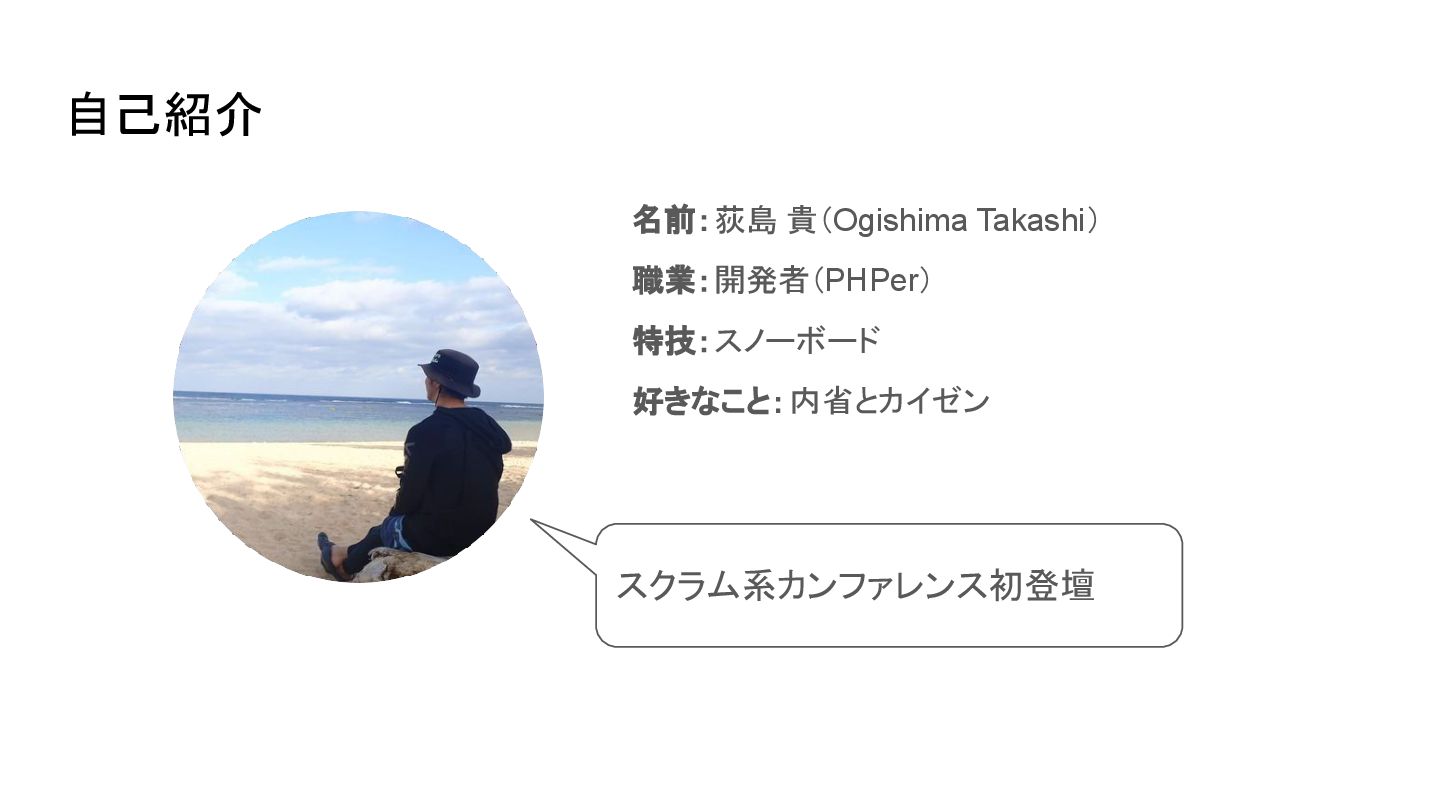 自己紹介 名前:荻島 貴(Ogishima Takashi) 職業:開発者(PHPer) 特技:スノーボード 好きなこと:内省とカイゼン スクラム系カンファレンス初登壇
