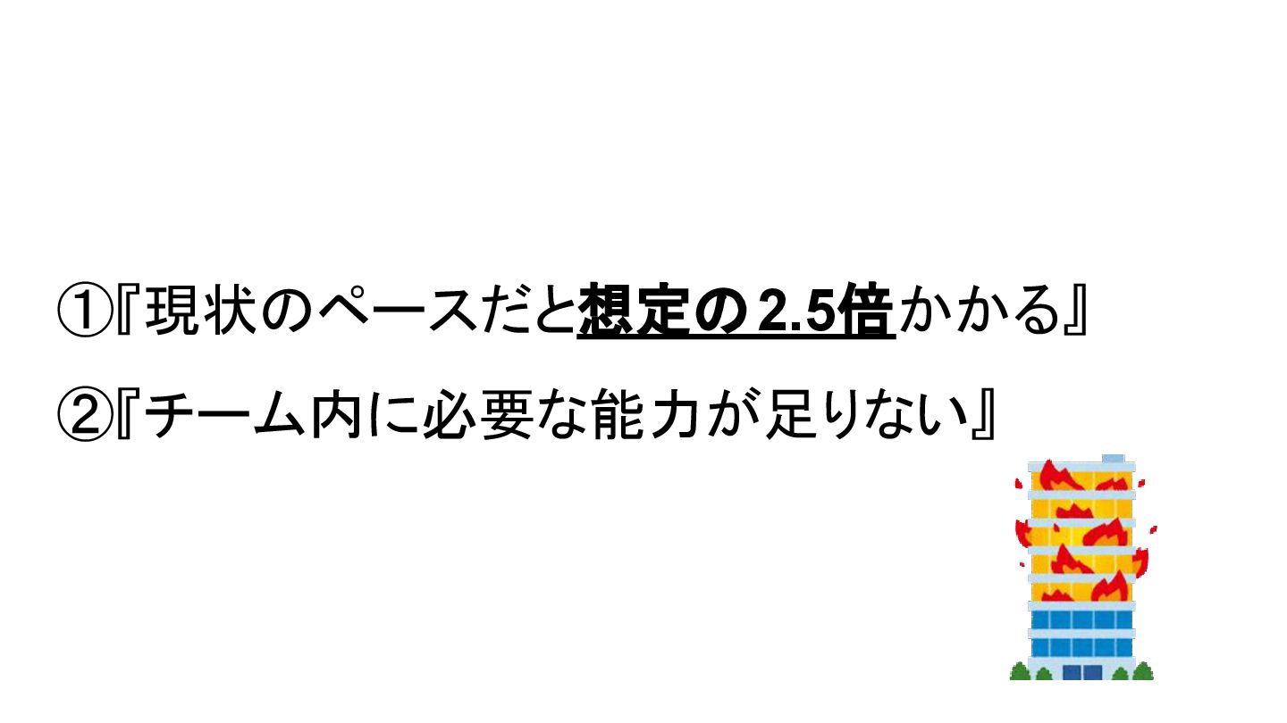 ①『現状のペースだと想定の2.5倍かかる』 ②『チーム内に必要な能力が足りない』
