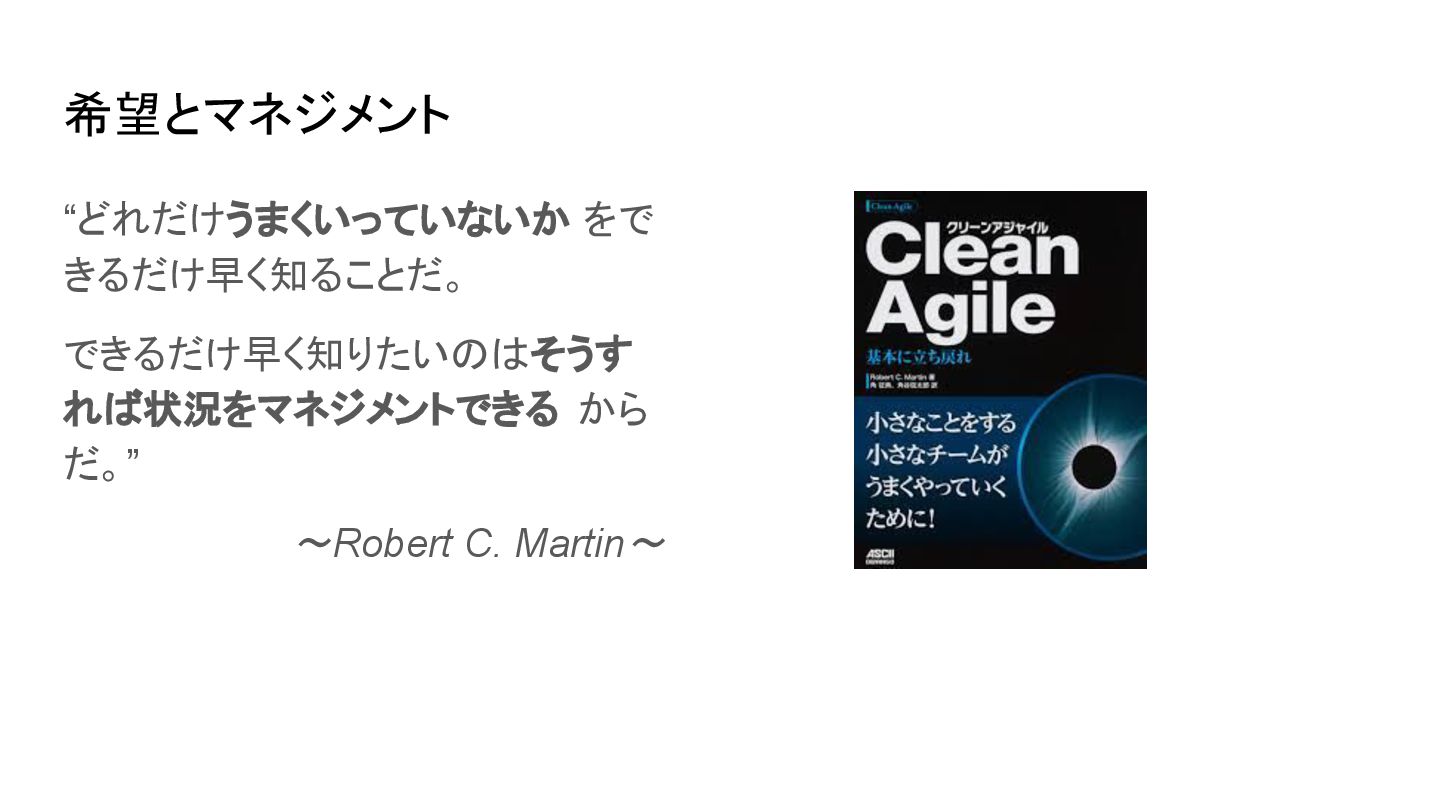 希望とマネジメント “どれだけうまくいっていないか をで きるだけ早く知ることだ。 できるだけ早く知りたいのはそうす れば状況をマネジメントできる から だ。” 〜Robert C.
