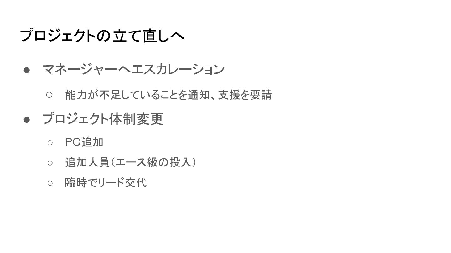 プロジェクトの立て直しへ • マネージャーへエスカレーション ◦ 能力が不足していることを通知、支援を要請 • プロジェクト体制変更 ◦ PO追加 ◦