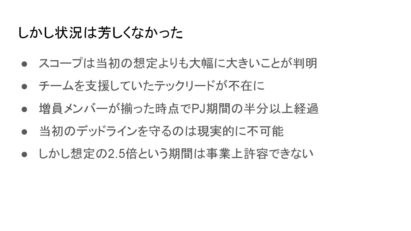 しかし状況は芳しくなかった • スコープは当初の想定よりも大幅に大きいことが判明 • チームを支援していたテックリードが不在に • 増員メンバーが揃った時点でPJ期間の半分以上経過 • 当初のデッドラインを守るのは現実的に不可能 •