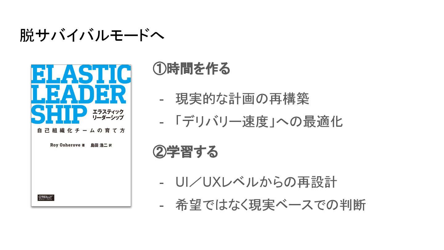 脱サバイバルモードへ ①時間を作る - 現実的な計画の再構築 - 「デリバリー速度」への最適化 ②学習する - UI/UXレベルからの再設計 -