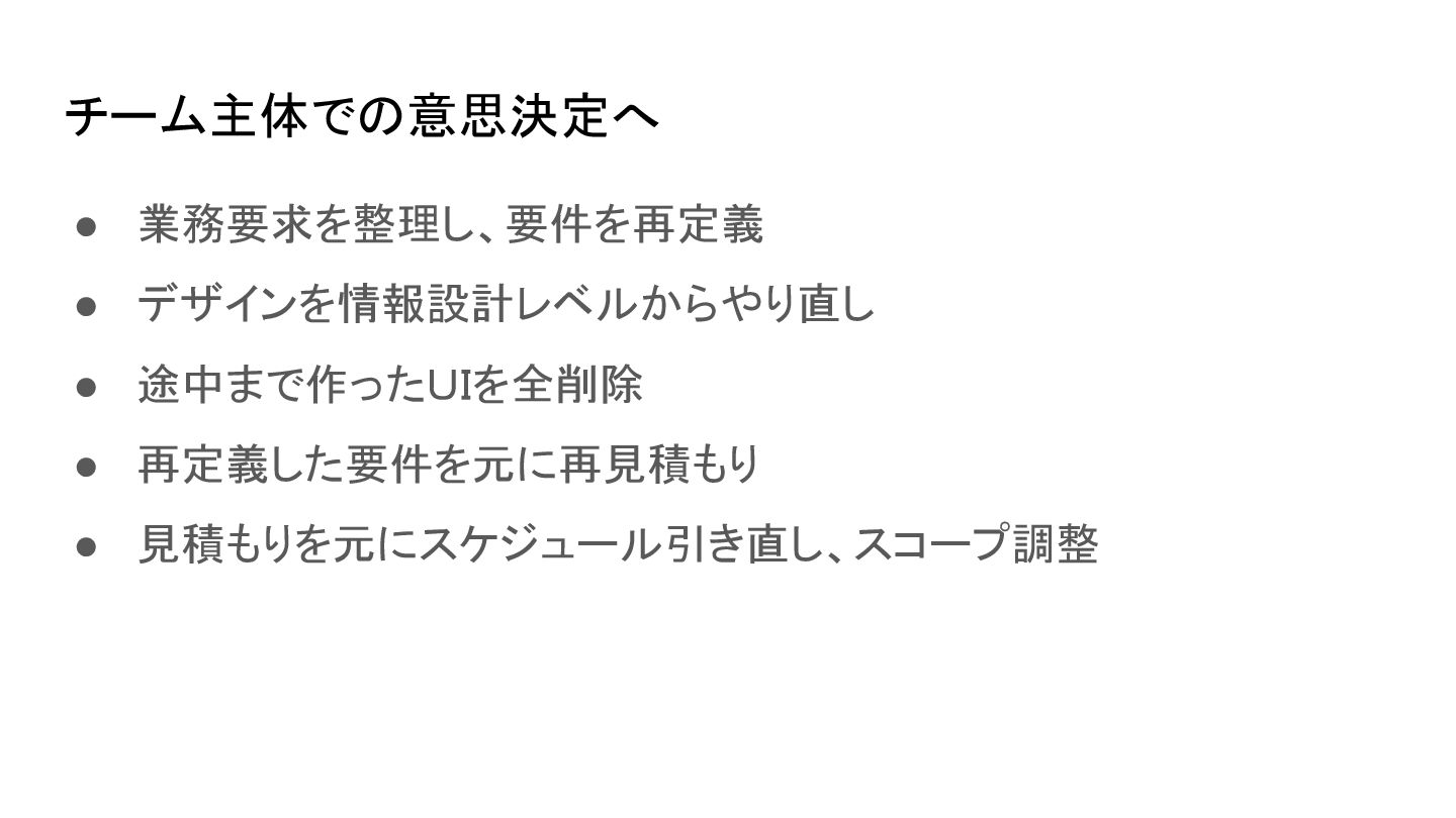 チーム主体での意思決定へ • 業務要求を整理し、要件を再定義 • デザインを情報設計レベルからやり直し • 途中まで作ったUIを全削除 • 再定義した要件を元に再見積もり •