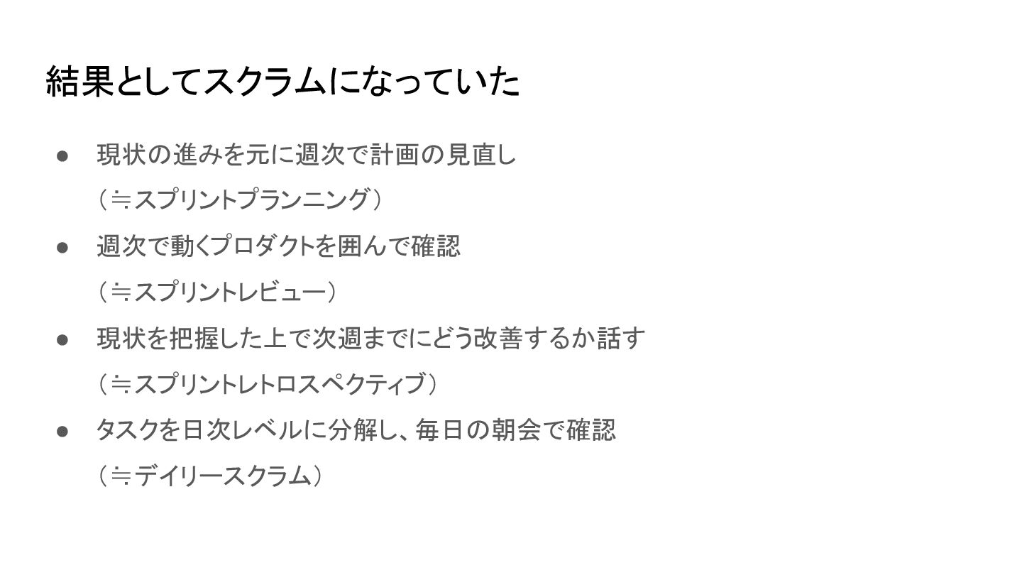 結果としてスクラムになっていた • 現状の進みを元に週次で計画の見直し (≒スプリントプランニング) • 週次で動くプロダクトを囲んで確認 (≒スプリントレビュー) • 現状を把握した上で次週までにどう改善するか話す (≒スプリントレトロスペクティブ)