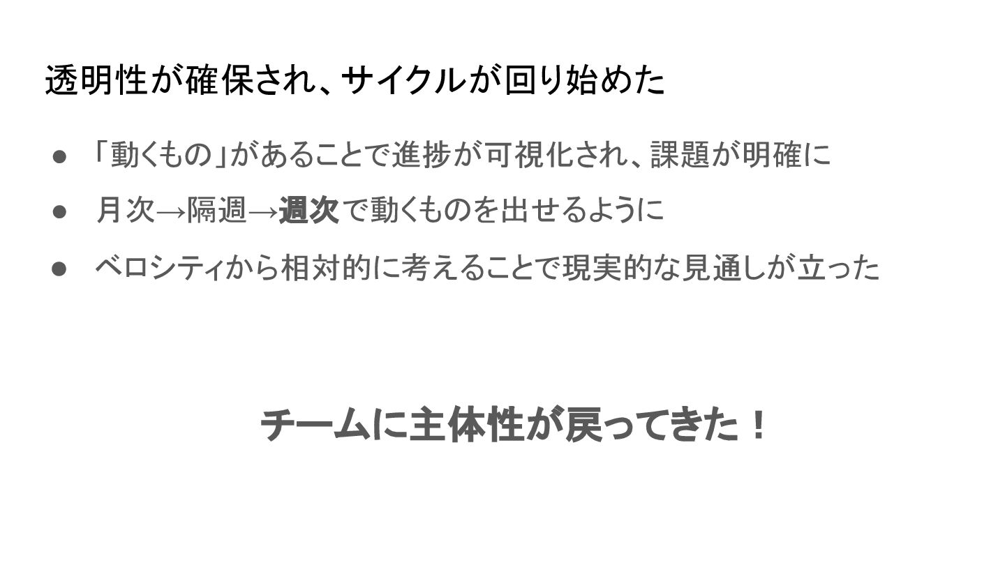透明性が確保され、サイクルが回り始めた • 「動くもの」があることで進捗が可視化され、課題が明確に • 月次→隔週→週次で動くものを出せるように • ベロシティから相対的に考えることで現実的な見通しが立った チームに主体性が戻ってきた!