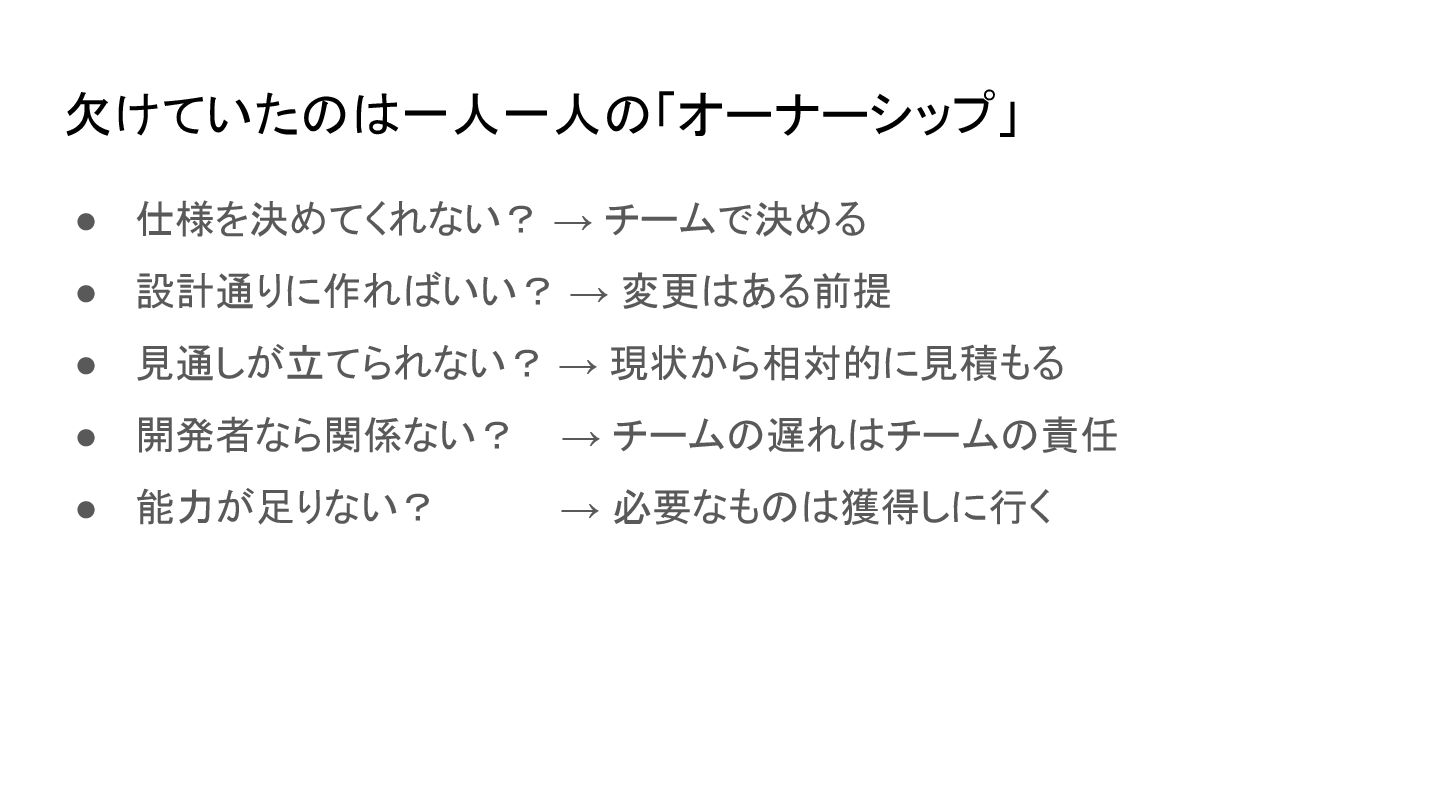 欠けていたのは一人一人の「オーナーシップ」 • 仕様を決めてくれない? → チームで決める • 設計通りに作ればいい? → 変更はある前提 •