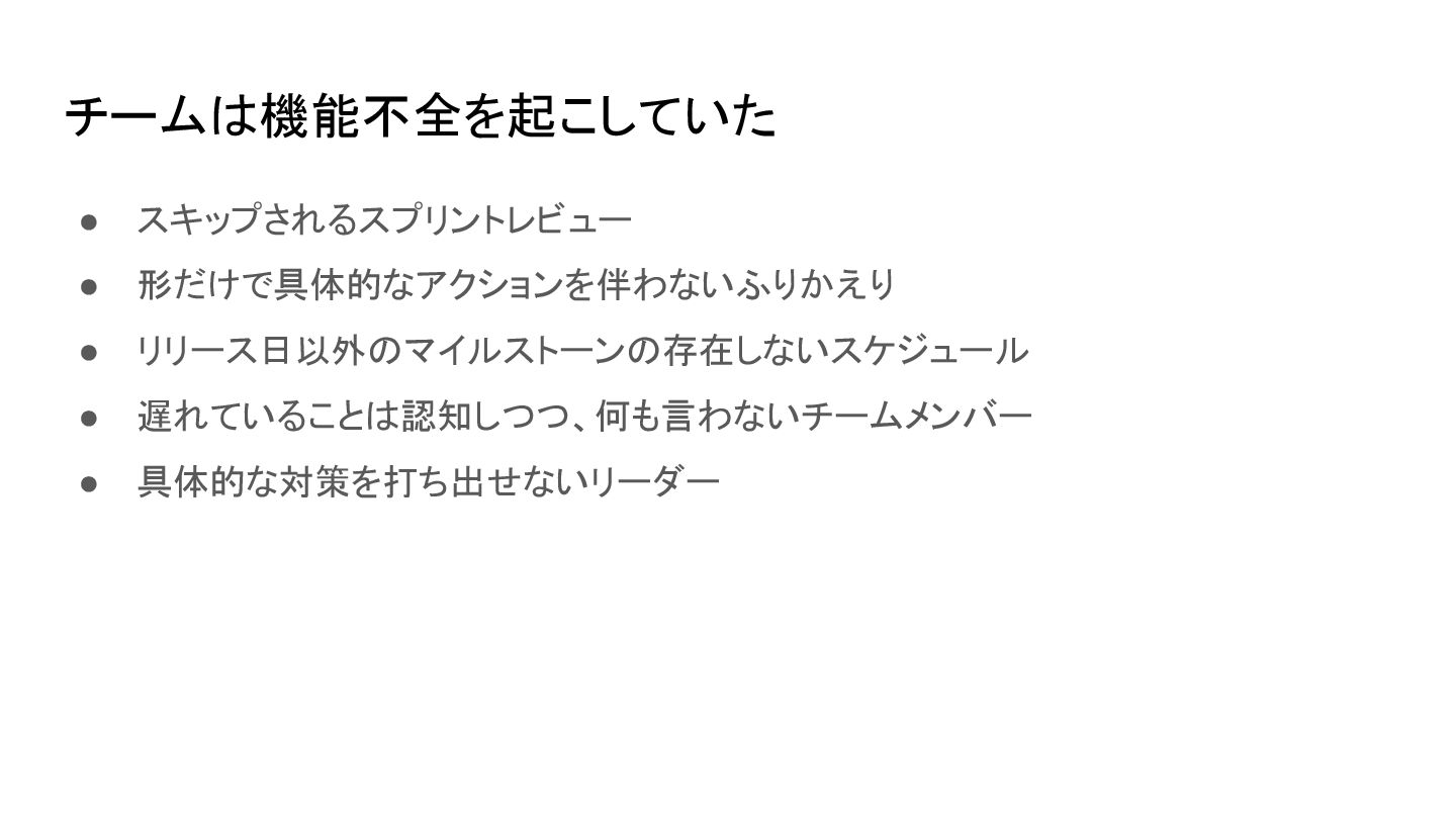 チームは機能不全を起こしていた • スキップされるスプリントレビュー • 形だけで具体的なアクションを伴わないふりかえり • リリース日以外のマイルストーンの存在しないスケジュール • 遅れていることは認知しつつ、何も言わないチームメンバー •