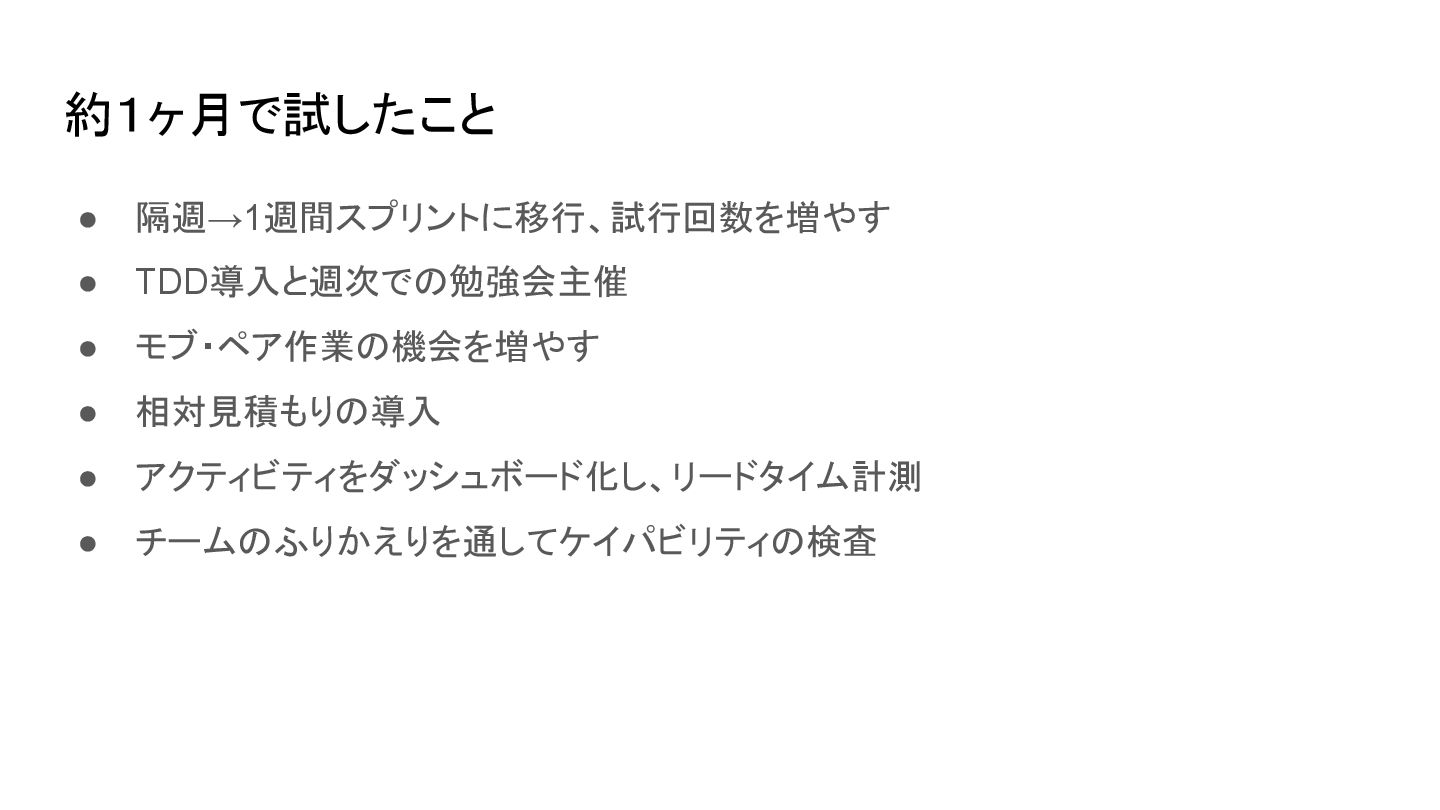 約1ヶ月で試したこと • 隔週→1週間スプリントに移行、試行回数を増やす • TDD導入と週次での勉強会主催 • モブ・ペア作業の機会を増やす • 相対見積もりの導入 •