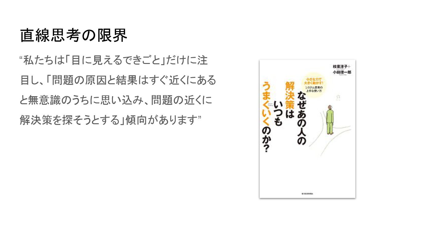 直線思考の限界 “私たちは「目に見えるできごと」だけに注 目し、「問題の原因と結果はすぐ近くにある と無意識のうちに思い込み、問題の近くに 解決策を探そうとする」傾向があります”