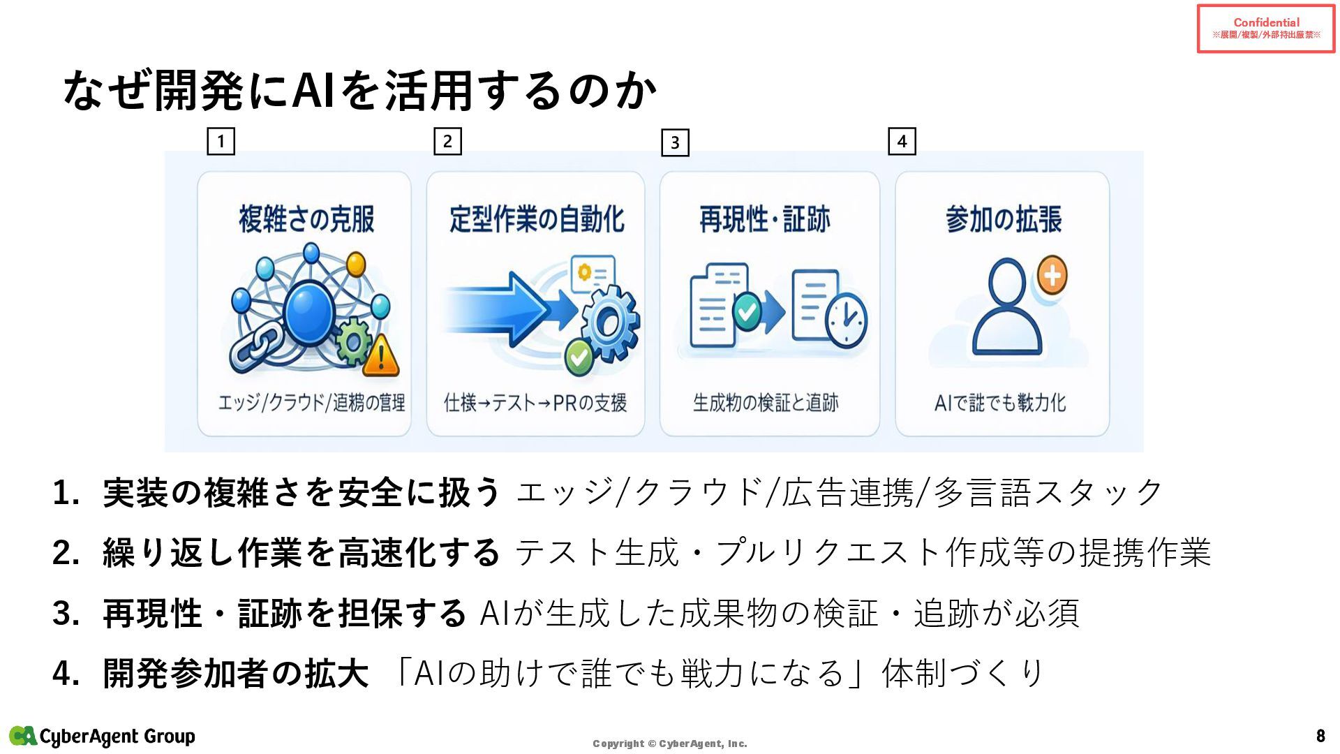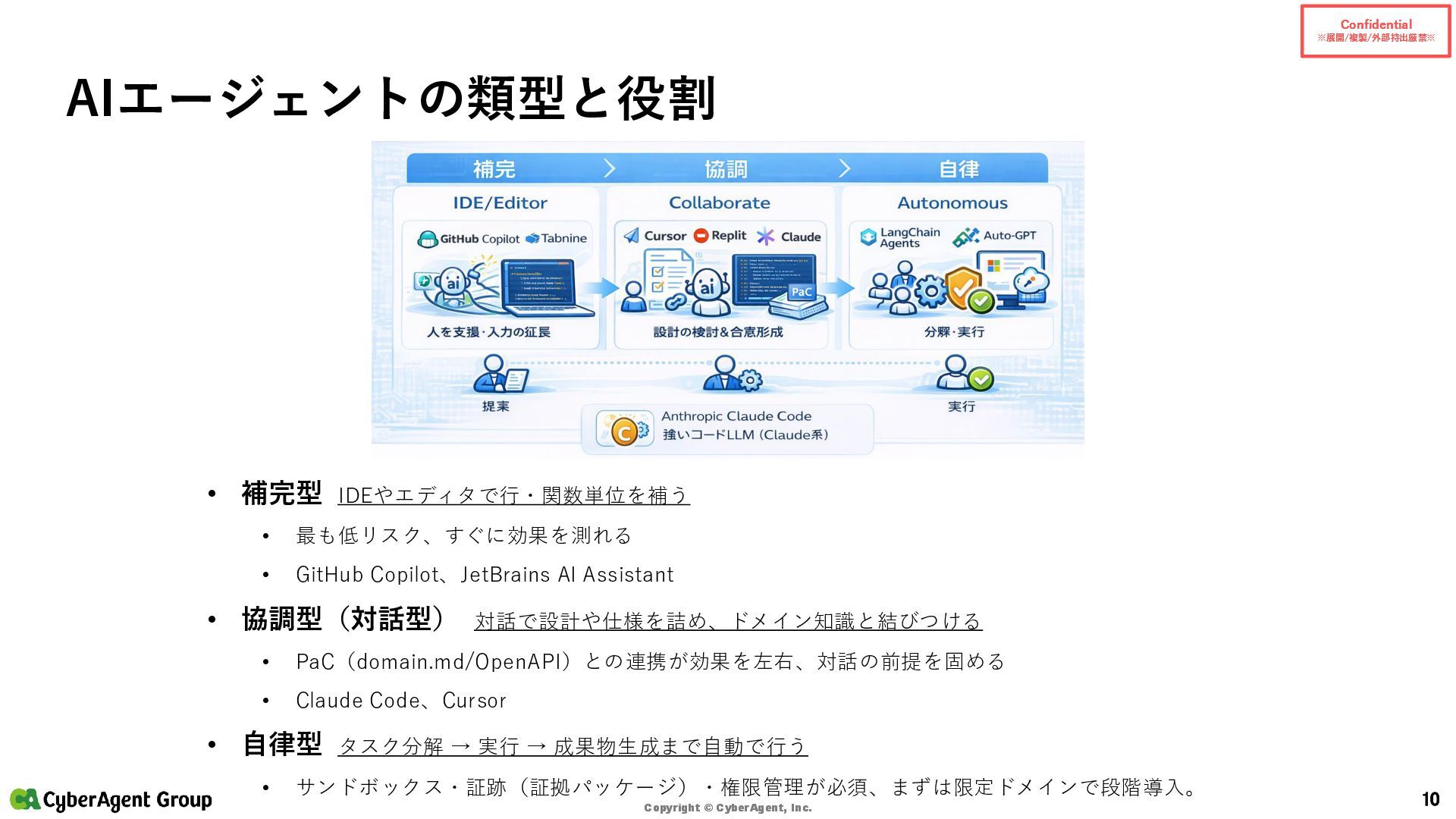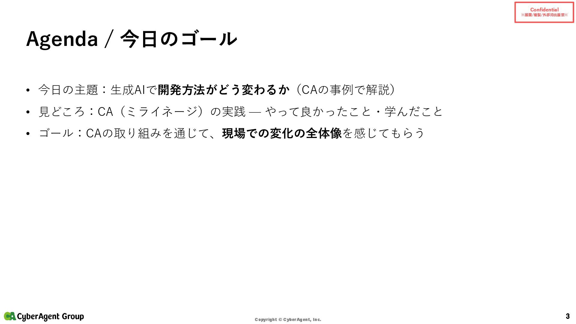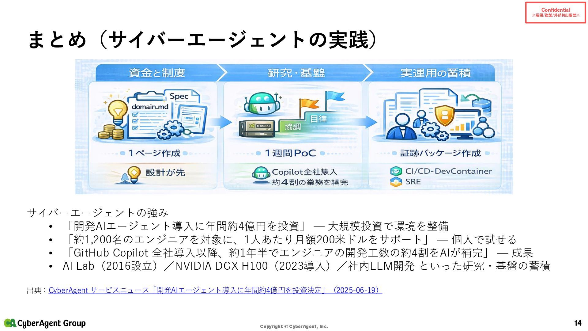 © CyberAgent, Inc. 14 まとめ(サイバーエージェントの実践) サイバーエージェントの強み • 「開発AIエージェント導入に年間約4億円を投資」 — 大規模投資で環境を整備 • 「約1,200名のエンジニアを対象に、1人あたり月額200米ドルをサポート」 — 個人で試せる • 「GitHub Copilot 全社導入以降、約1年半でエンジニアの開発工数の約4割をAIが補完」 — 成果 • AI Lab(2016設立)/NVIDIA DGX H100(2023導入)/社内LLM開発 といった研究・基盤の蓄積 出典:CyberAgent サービスニュース「開発AIエージェント導入に年間約4億円を投資決定」(2025-06-19)