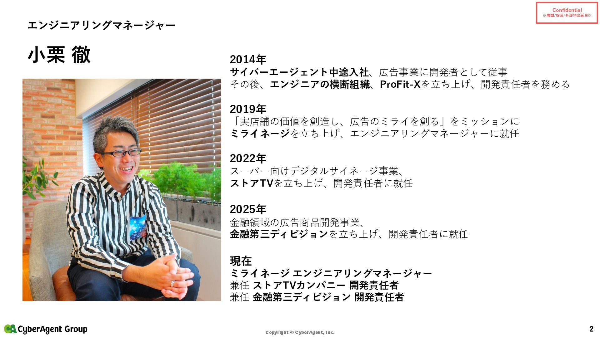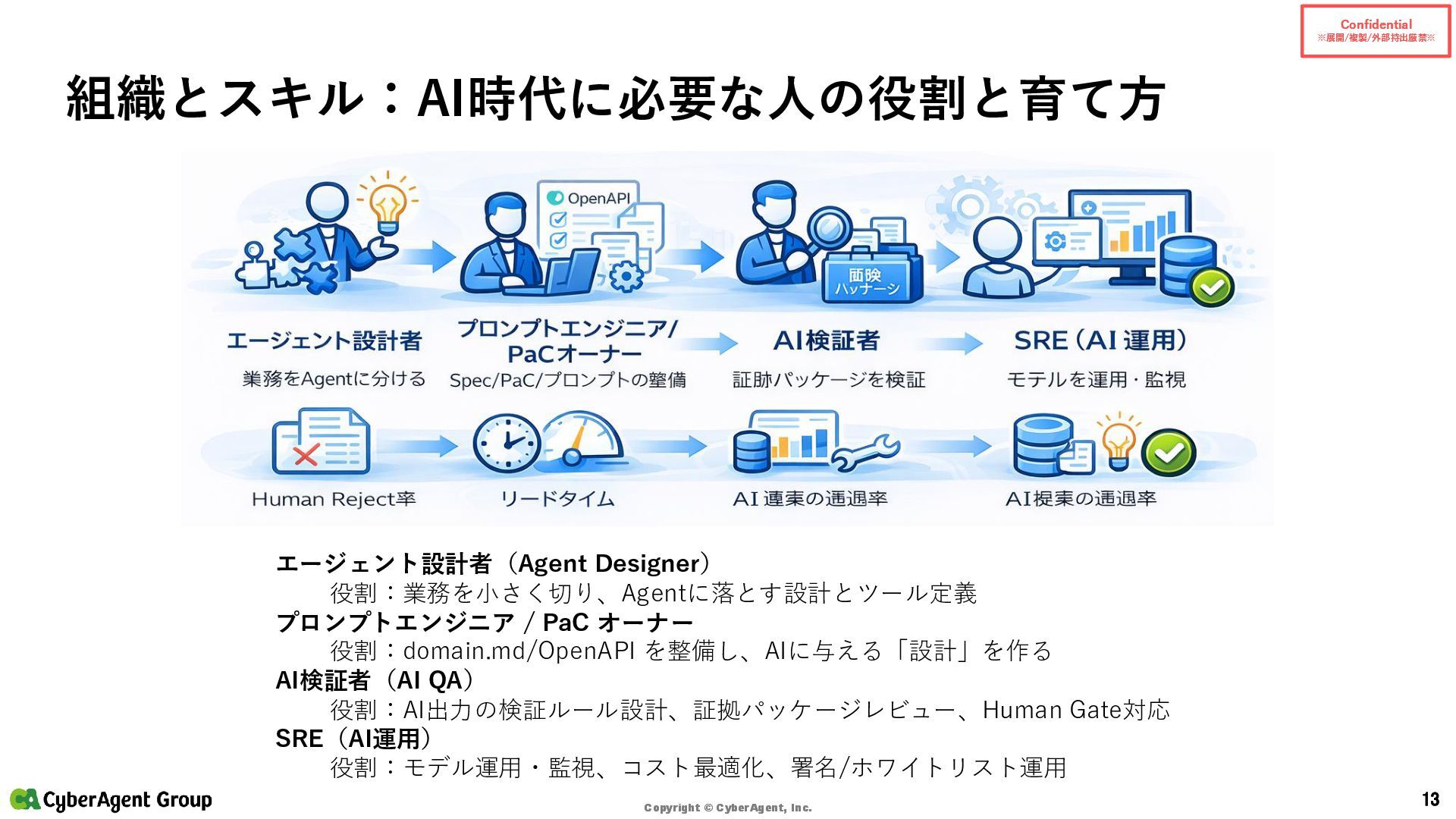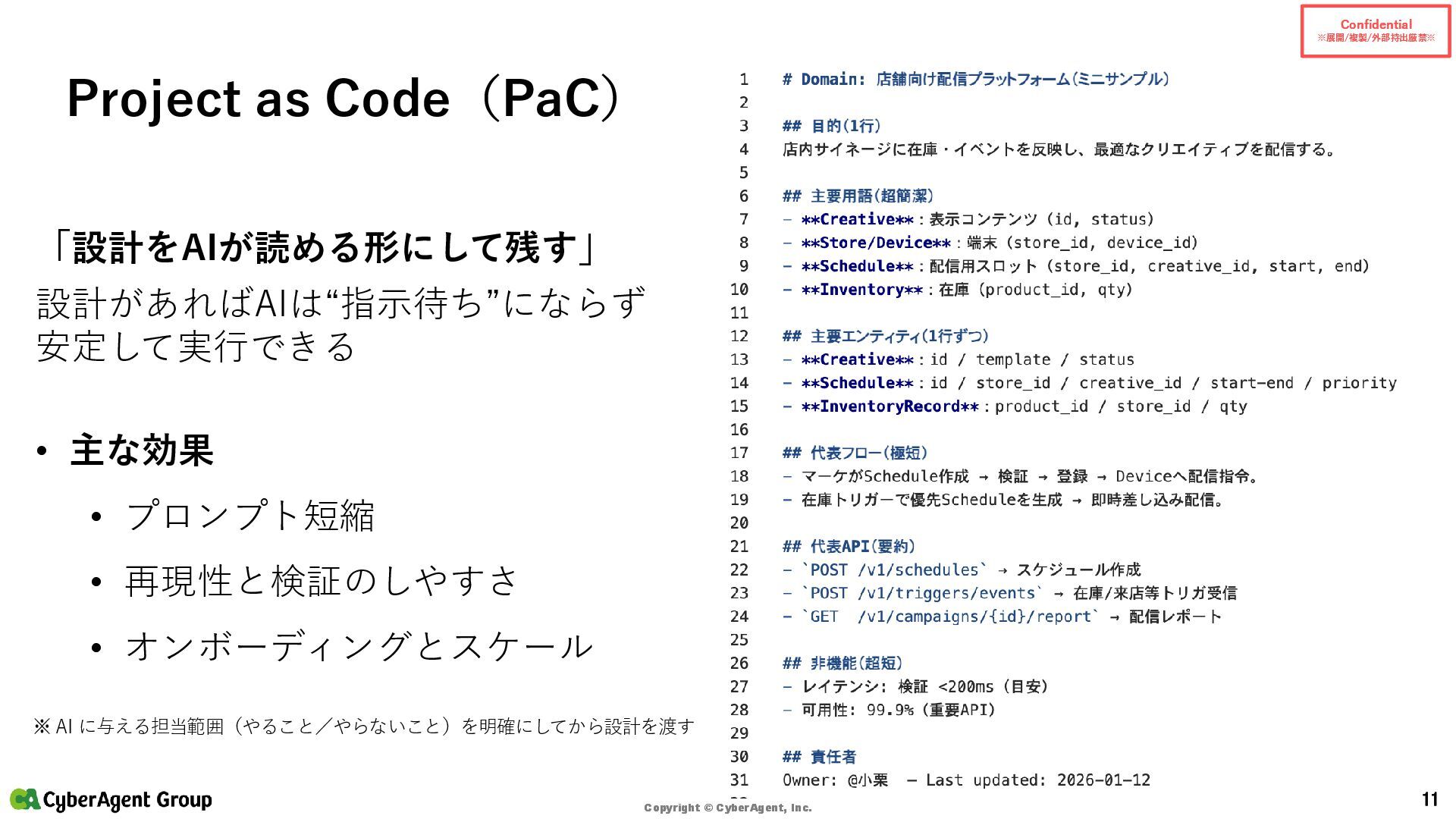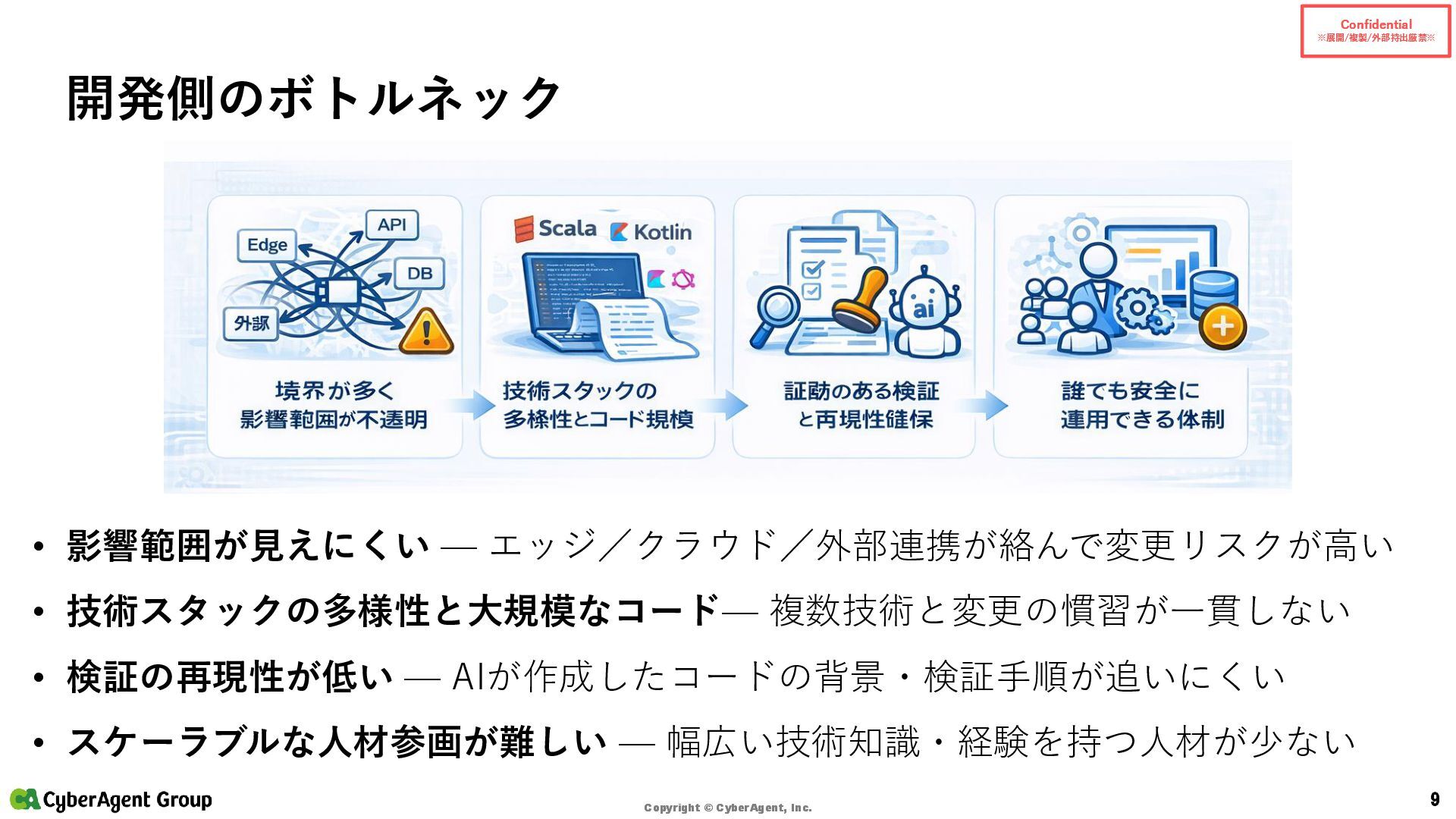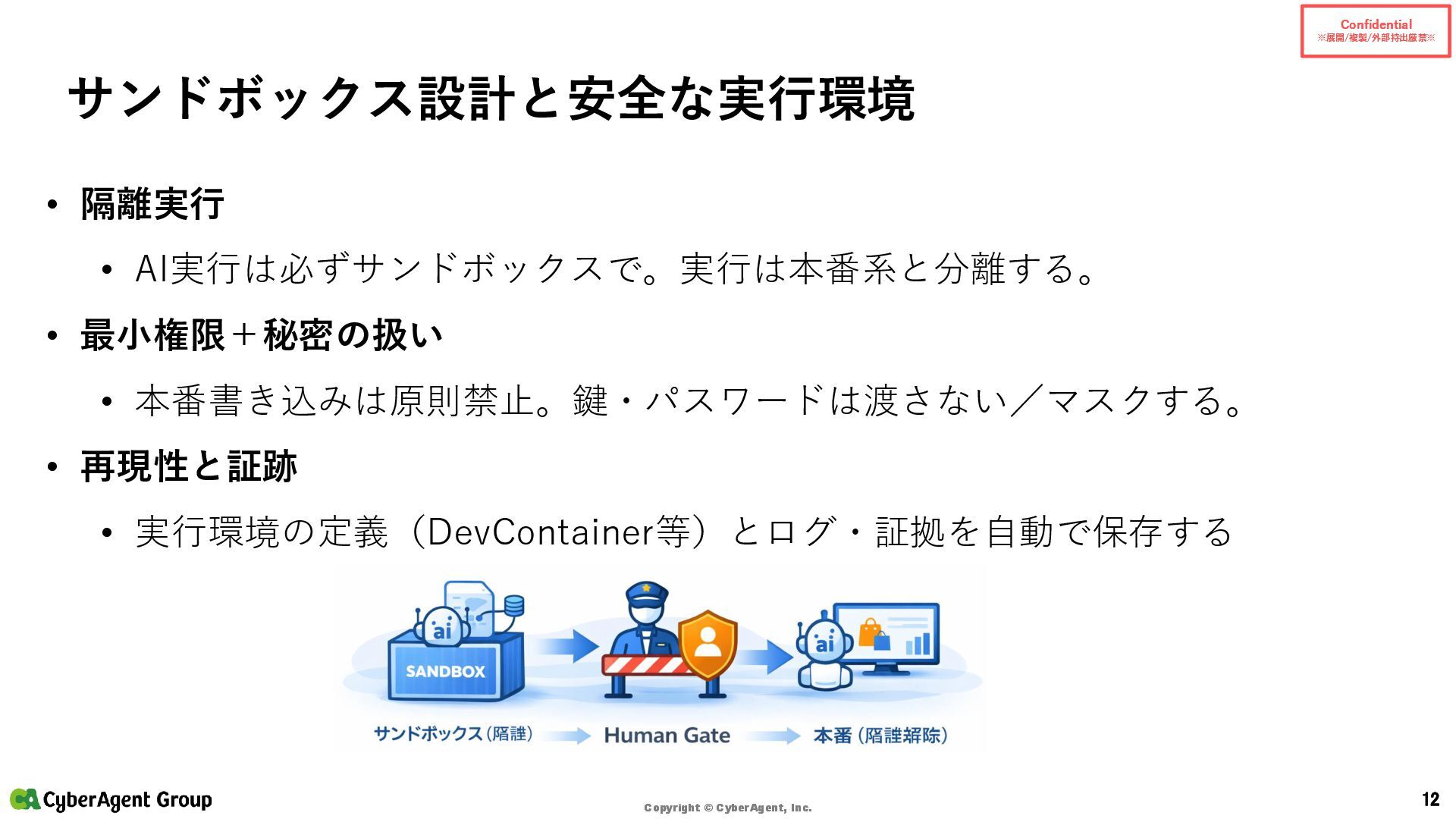 © CyberAgent, Inc. 14 まとめ(サイバーエージェントの実践) サイバーエージェントの強み • 「開発AIエージェント導入に年間約4億円を投資」 — 大規模投資で環境を整備 • 「約1,200名のエンジニアを対象に、1人あたり月額200米ドルをサポート」 — 個人で試せる • 「GitHub Copilot 全社導入以降、約1年半でエンジニアの開発工数の約4割をAIが補完」 — 成果 • AI Lab(2016設立)/NVIDIA DGX H100(2023導入)/社内LLM開発 といった研究・基盤の蓄積 出典:CyberAgent サービスニュース「開発AIエージェント導入に年間約4億円を投資決定」(2025-06-19)