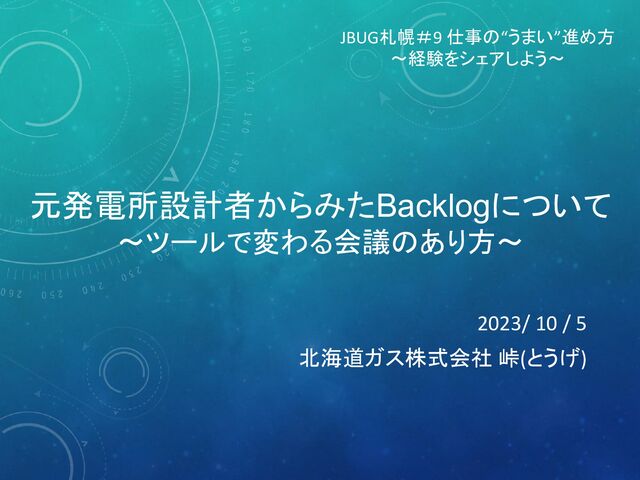 元発電所設計者からみたBacklogについて ~ツールで変わる会議のあり方~ 2023/ 10 / 5 北海道ガス株式会社 峠(とうげ) JBUG札幌#9 仕事の“うまい”進め方