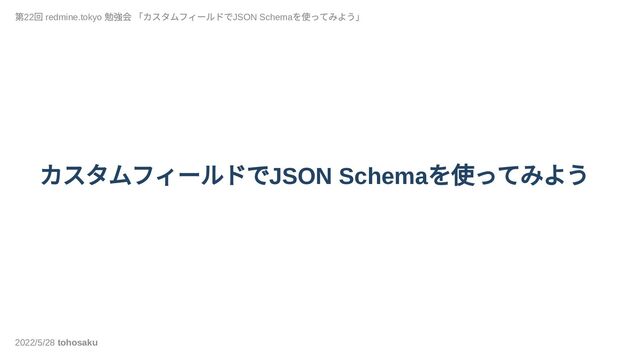 cf_3 => 家族1_ 同居 cf_4 => 家族1_ 職業 cf_5 => 家族2_ 名 cf_6 => 家族2_ 年齢 cf_7 => 家族2_ 同居 cf_8 => 家族2_ 職業 cf_9 => 家族3_ 名 cf_10 => 家族3_ 年齢 cf_11 => 家族3_ 同居 cf_12 => 家族3_ 職業 cf_13 => 家族4_ 名 cf_14 => 家族4_ 年齢 cf_15 => 家族4_ 同居 cf_16 => 家族4_ 職業 cf_17 => 家族5_ 名 cf_18 => 家族5_ 年齢 cf_19 => 家族5_ 同居 cf_20 => 家族5_ 職業 とても辛い…… というか、行をもっと増やしてほしいとかに機動的に対処できない。 第22 回 redmine.tokyo 勉強会 「カスタムフィールドでJSON Schema を使ってみよう」 2022/5/28 tohosaku