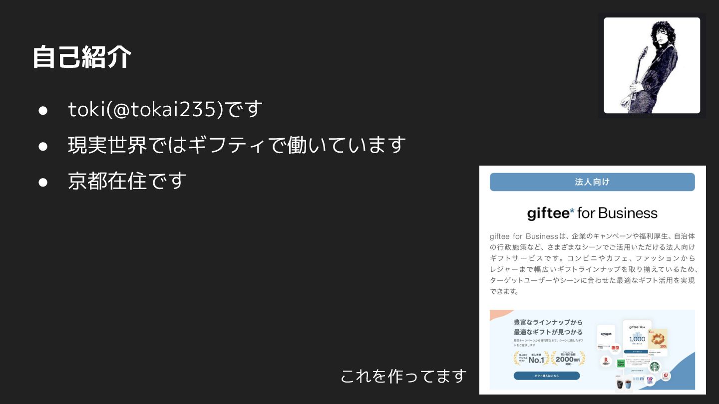 自己紹介 • toki(@tokai235)です • 現実世界ではギフティで働いています • 京都在住です これを作ってます