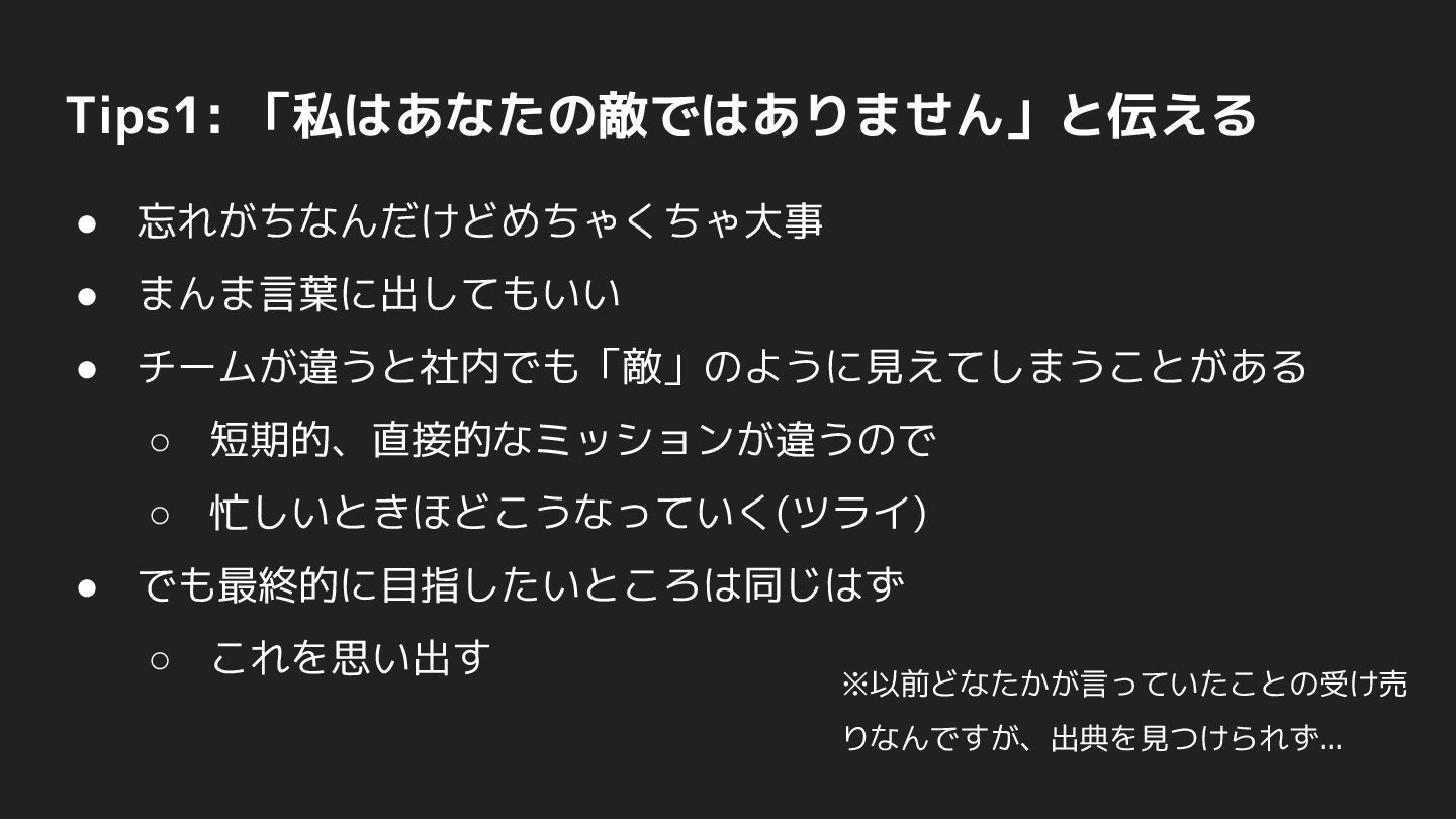Tips1: 「私はあなたの敵ではありません」と伝える • 忘れがちなんだけどめちゃくちゃ大事 • まんま言葉に出してもいい • チームが違うと社内でも「敵」のように見えてしまうことがある ◦ 短期的、直接的なミッションが違うので