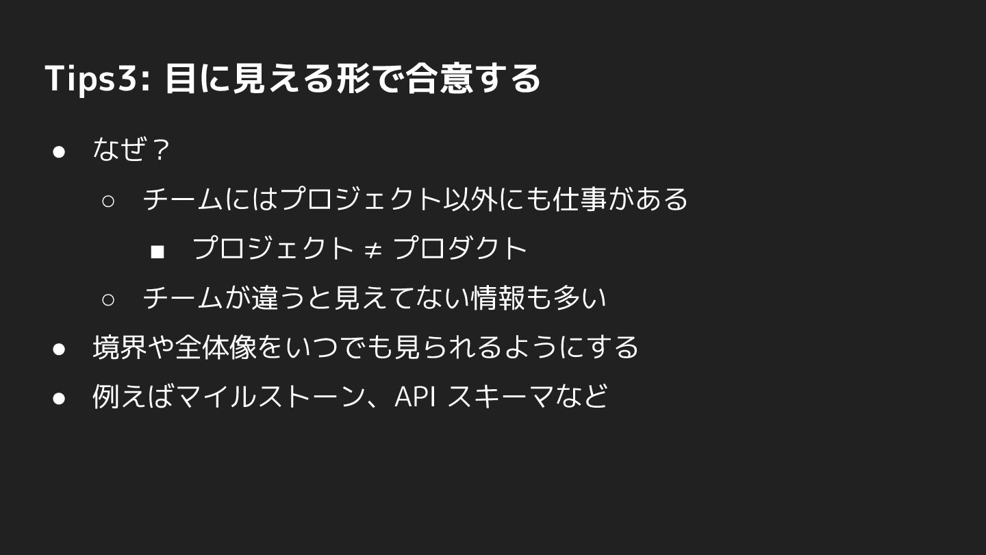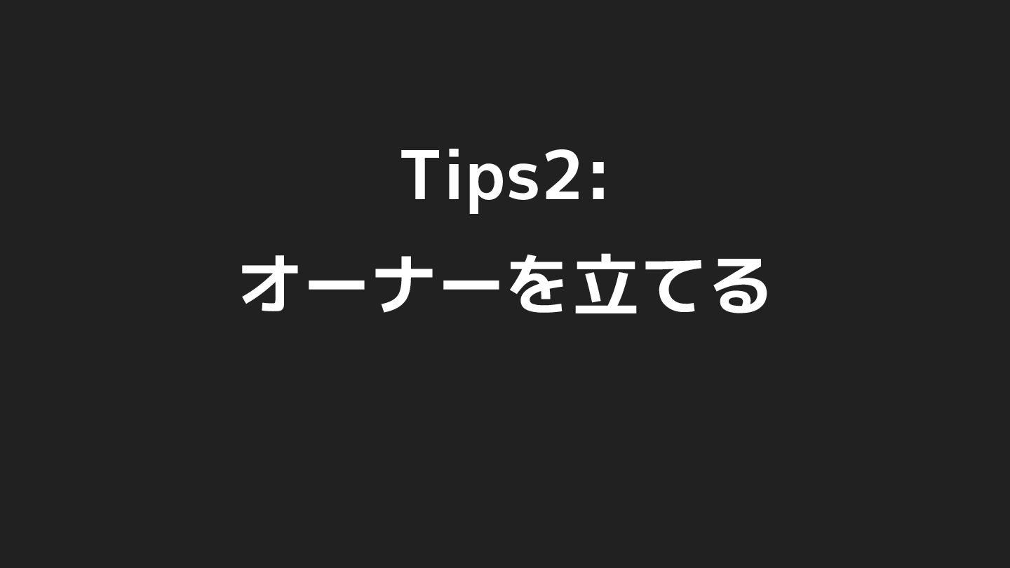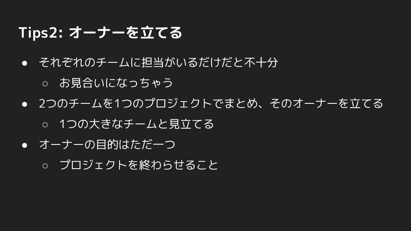 Tips2: オーナーを立てる • それぞれのチームに担当がいるだけだと不十分 ◦ お見合いになっちゃう • 2つのチームを1つのプロジェクトでまとめ、そのオーナーを立てる ◦ 1つの大きなチームと見立てる