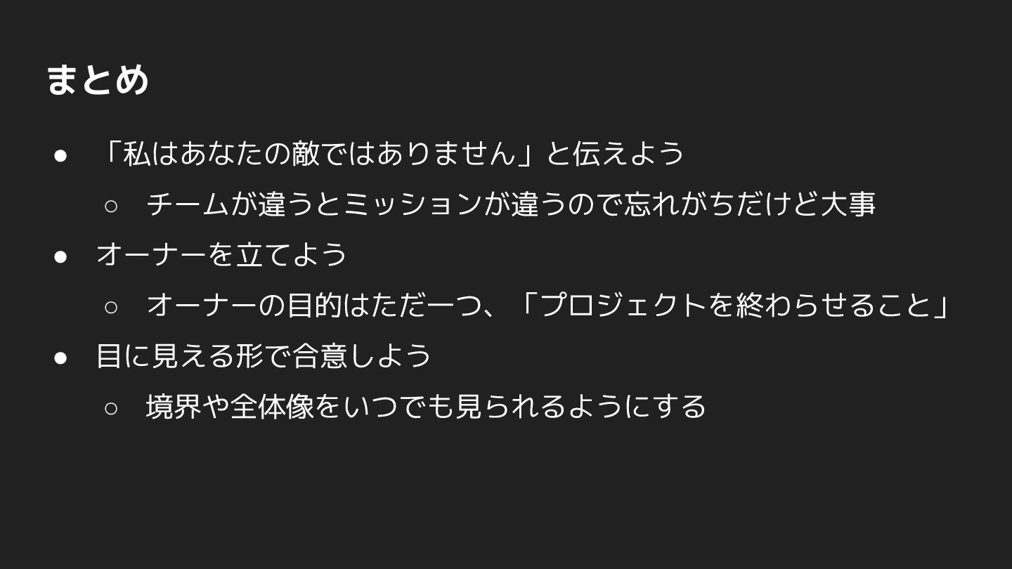 まとめ • 「私はあなたの敵ではありません」と伝えよう ◦ チームが違うとミッションが違うので忘れがちだけど大事 • オーナーを立てよう ◦ オーナーの目的はただ一つ、「プロジェクトを終わらせること」 •