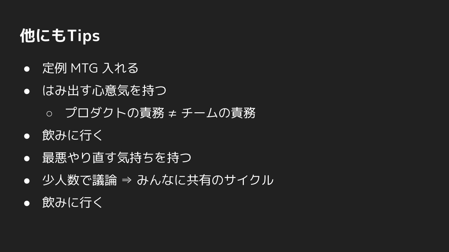 他にもTips • 定例 MTG 入れる • はみ出す心意気を持つ ◦ プロダクトの責務 ≠