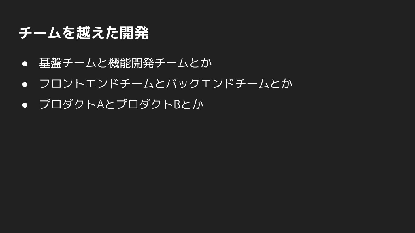 チームを越えた開発 • 基盤チームと機能開発チームとか • フロントエンドチームとバックエンドチームとか • プロダクトAとプロダクトBとか