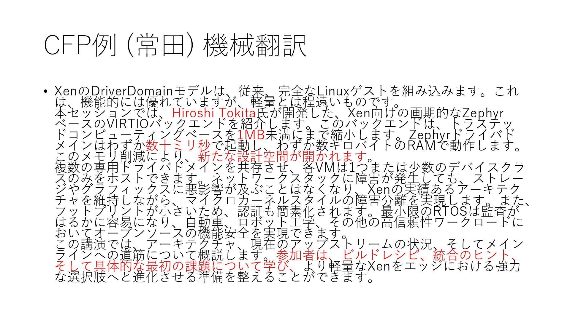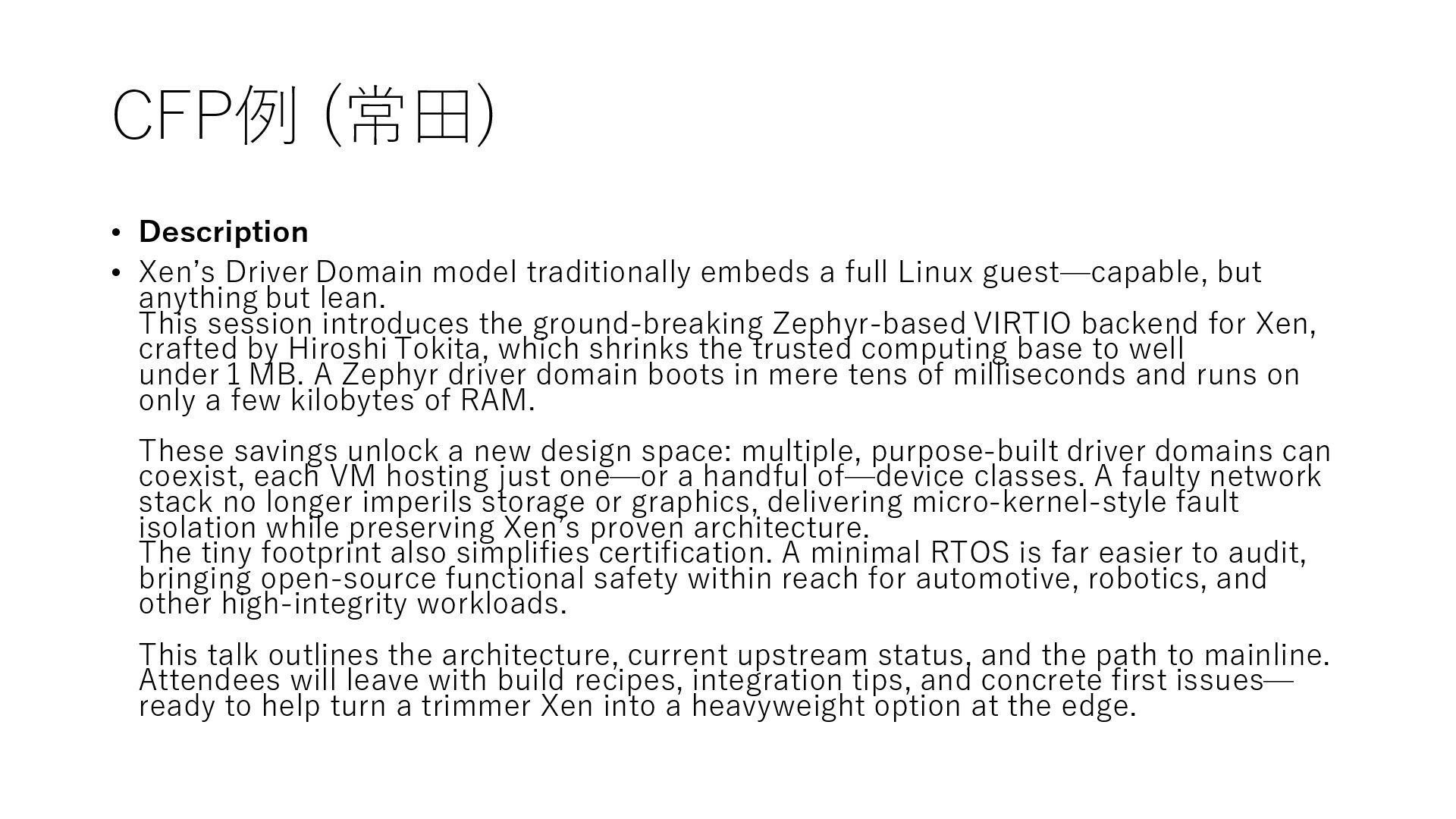 embeds a full Linux guest—capable, but anything but lean. This session introduces the ground-breaking Zephyr-based VIRTIO backend for Xen, crafted by Hiroshi Tokita, which shrinks the trusted computing base to well under 1 MB. A Zephyr driver domain boots in mere tens of milliseconds and runs on only a few kilobytes of RAM. These savings unlock a new design space: multiple, purpose-built driver domains can coexist, each VM hosting just one—or a handful of—device classes. A faulty network stack no longer imperils storage or graphics, delivering micro-kernel-style fault isolation while preserving Xen’s proven architecture. The tiny footprint also simplifies certification. A minimal RTOS is far easier to audit, bringing open-source functional safety within reach for automotive, robotics, and other high-integrity workloads. This talk outlines the architecture, current upstream status, and the path to mainline. Attendees will leave with build recipes, integration tips, and concrete first issues— ready to help turn a trimmer Xen into a heavyweight option at the edge.