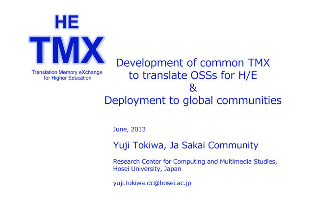 Higher Education June, 2013 Yuji Tokiwa, Ja Sakai Community Research Center for Computing and Multimedia Studies, Hosei University, Japan [email protected] Development of common TMX to translate OSSs for H/E & Deployment to global communities