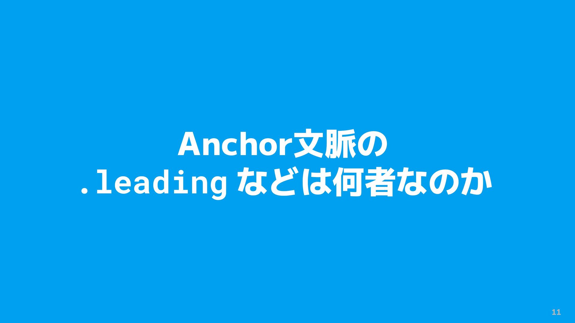 • スクロール後は一番近い要素の左端で 止まる ◦ anchor: .leading を指定 10 ViewAlignedScrollTargetBehavior (limitBehavior:anchor:)