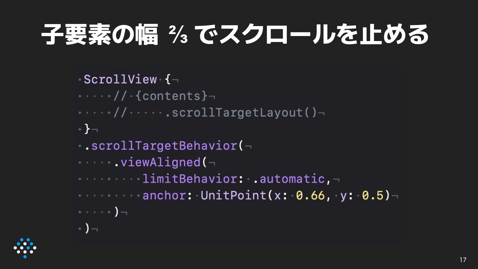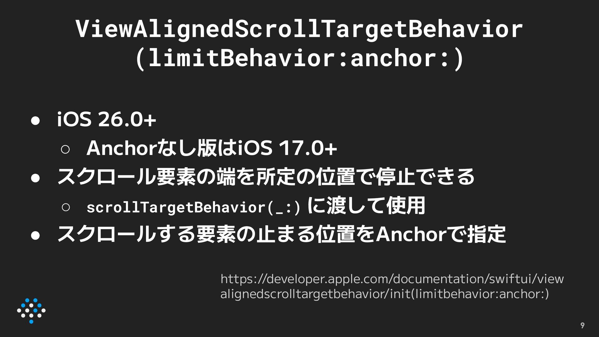 ViewAlignedScrollTargetBehavior (limitBehavior:anchor:) • iOS 26.0+ ◦ Anchorなし版はiOS 17.0+ • スクロール要素の端を所定の位置で停止できる