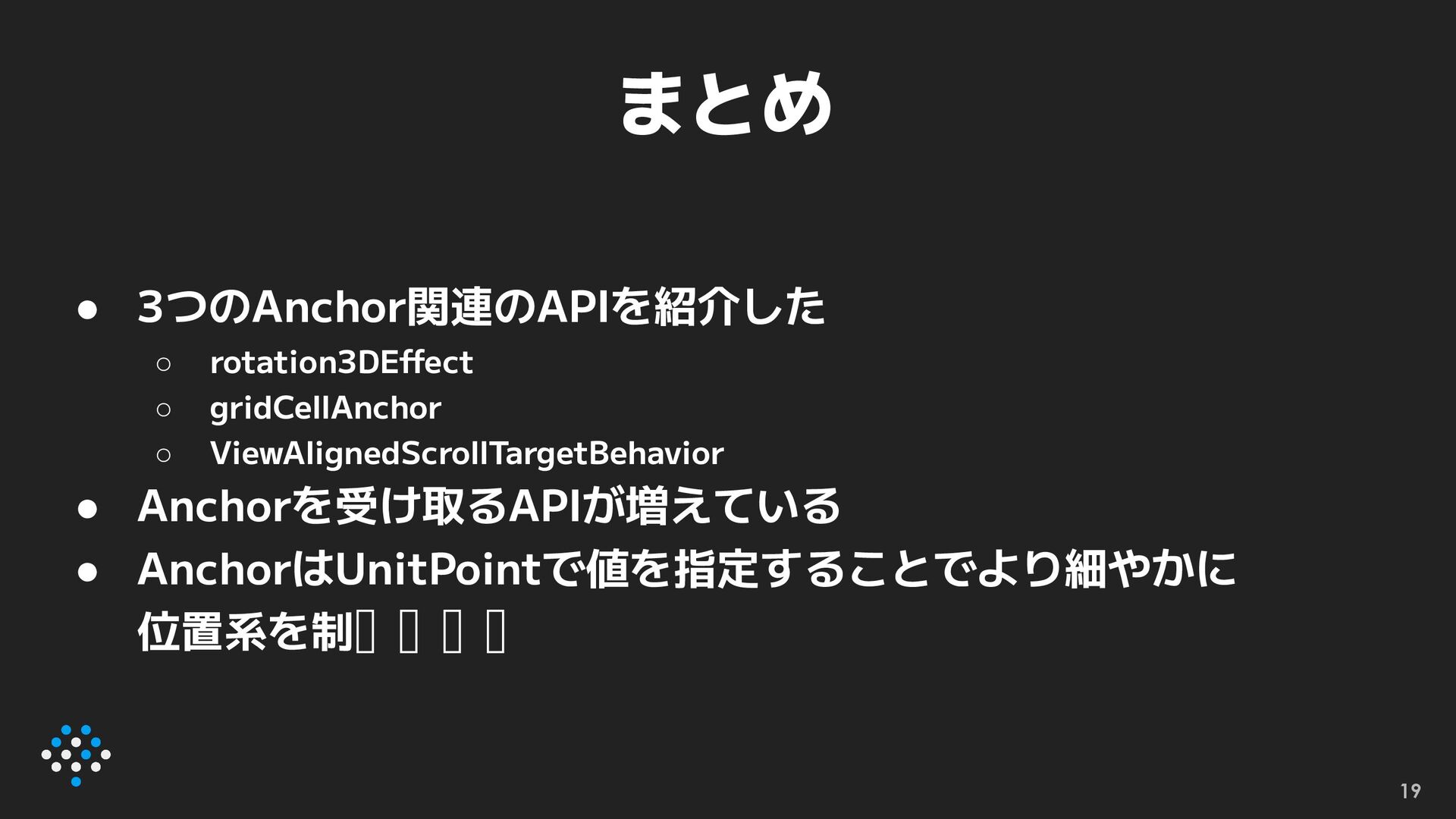 まとめ • 3つのAnchor関連のAPIを紹介した ◦ rotation3DEffect ◦ gridCellAnchor ◦ ViewAlignedScrollTargetBehavior •