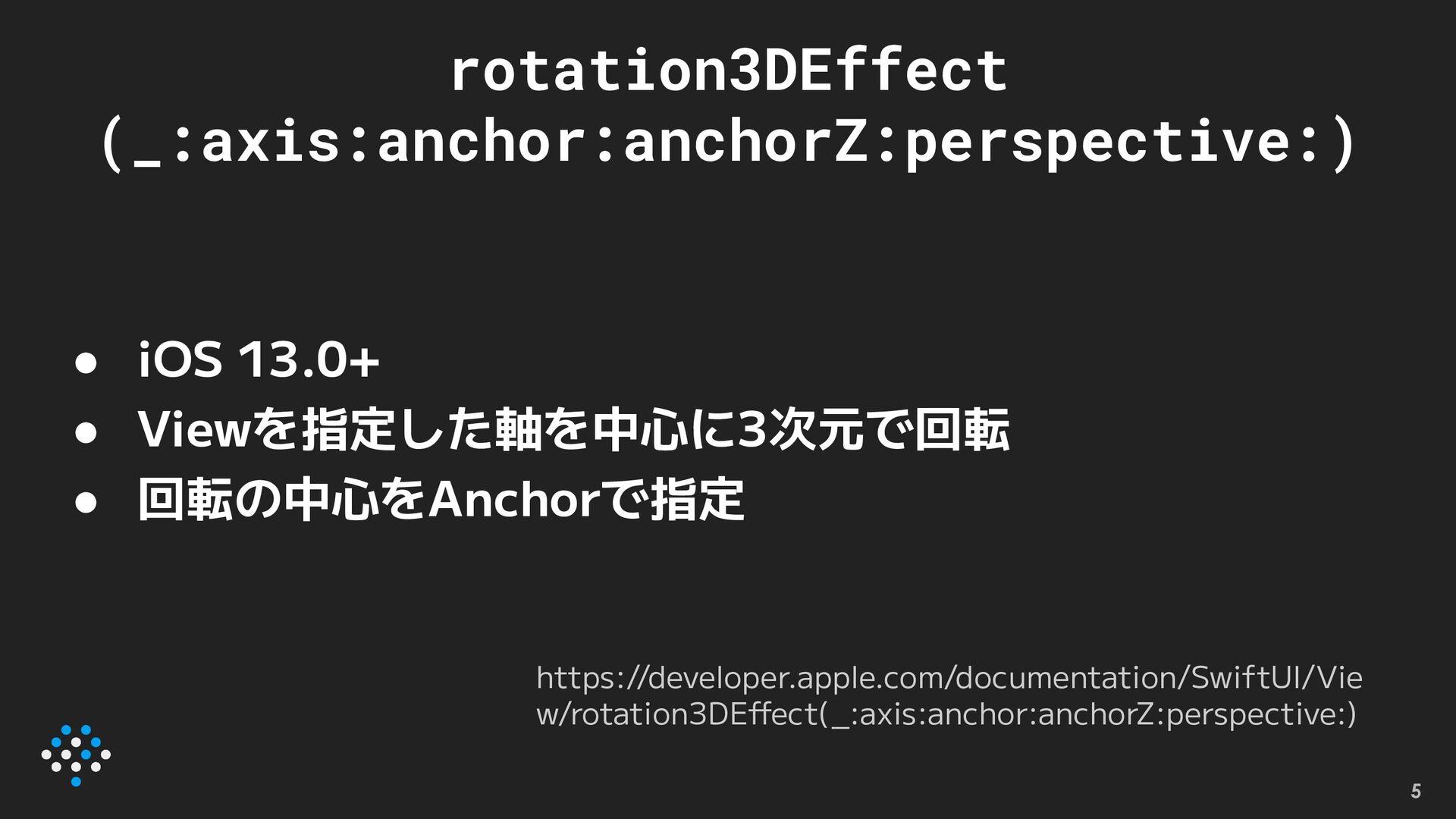 rotation3DEffect (_:axis:anchor:anchorZ:perspective:) • iOS 13.0+ • Viewを指定した軸を中心に3次元で回転 • 回転の中心をAnchorで指定 5
