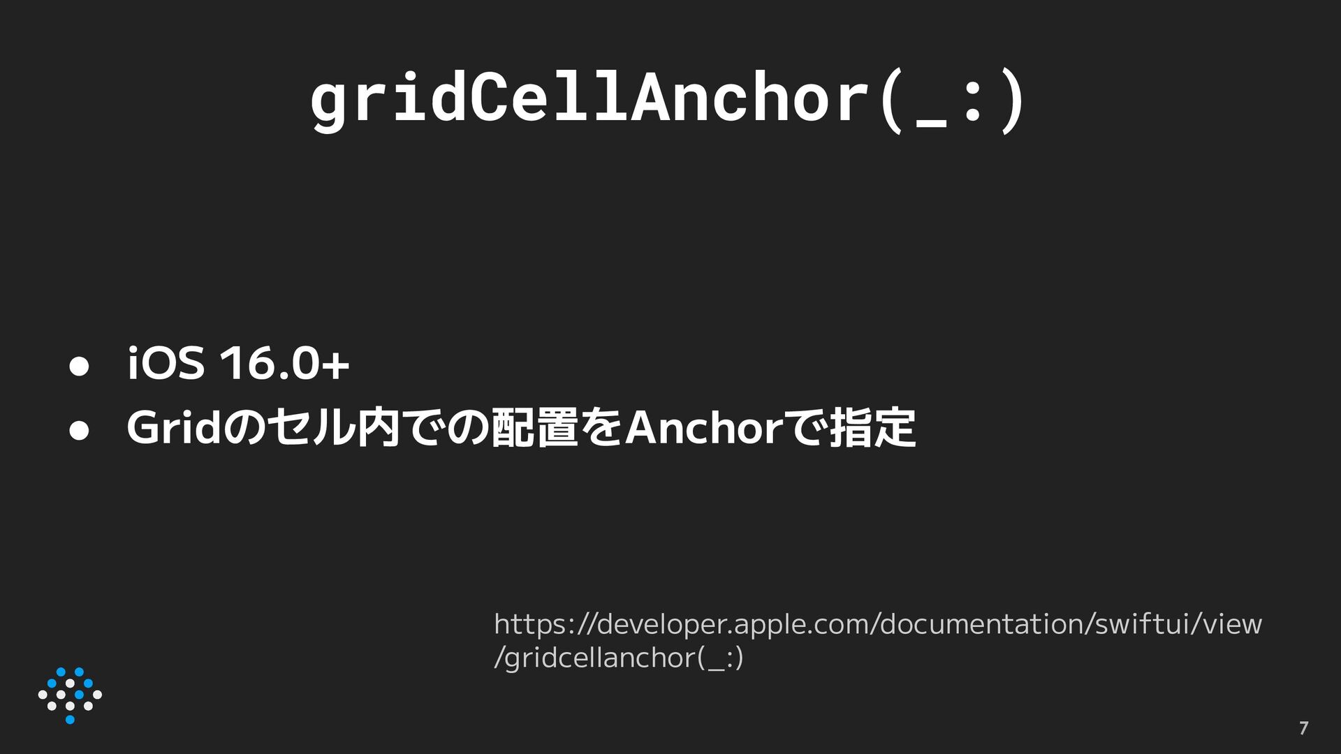 gridCellAnchor(_:) • iOS 16.0+ • Gridのセル内での配置をAnchorで指定 7 https://developer.apple.com/documentation/swiftui/view /gridcellanchor(_:)