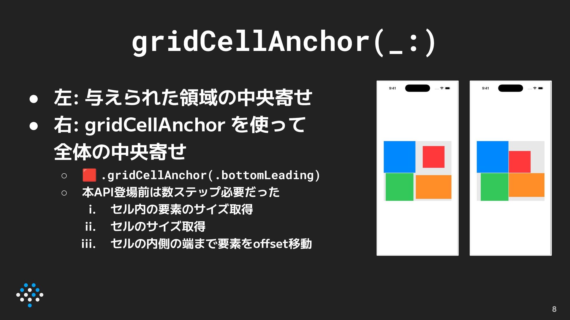 .gridCellAnchor(.bottomLeading) ◦ 本API登場前は数ステップ必要だった i. セル内の要素のサイズ取得 ii. セルのサイズ取得 iii. セルの内側の端まで要素をoffset移動 gridCellAnchor(_:) 8
